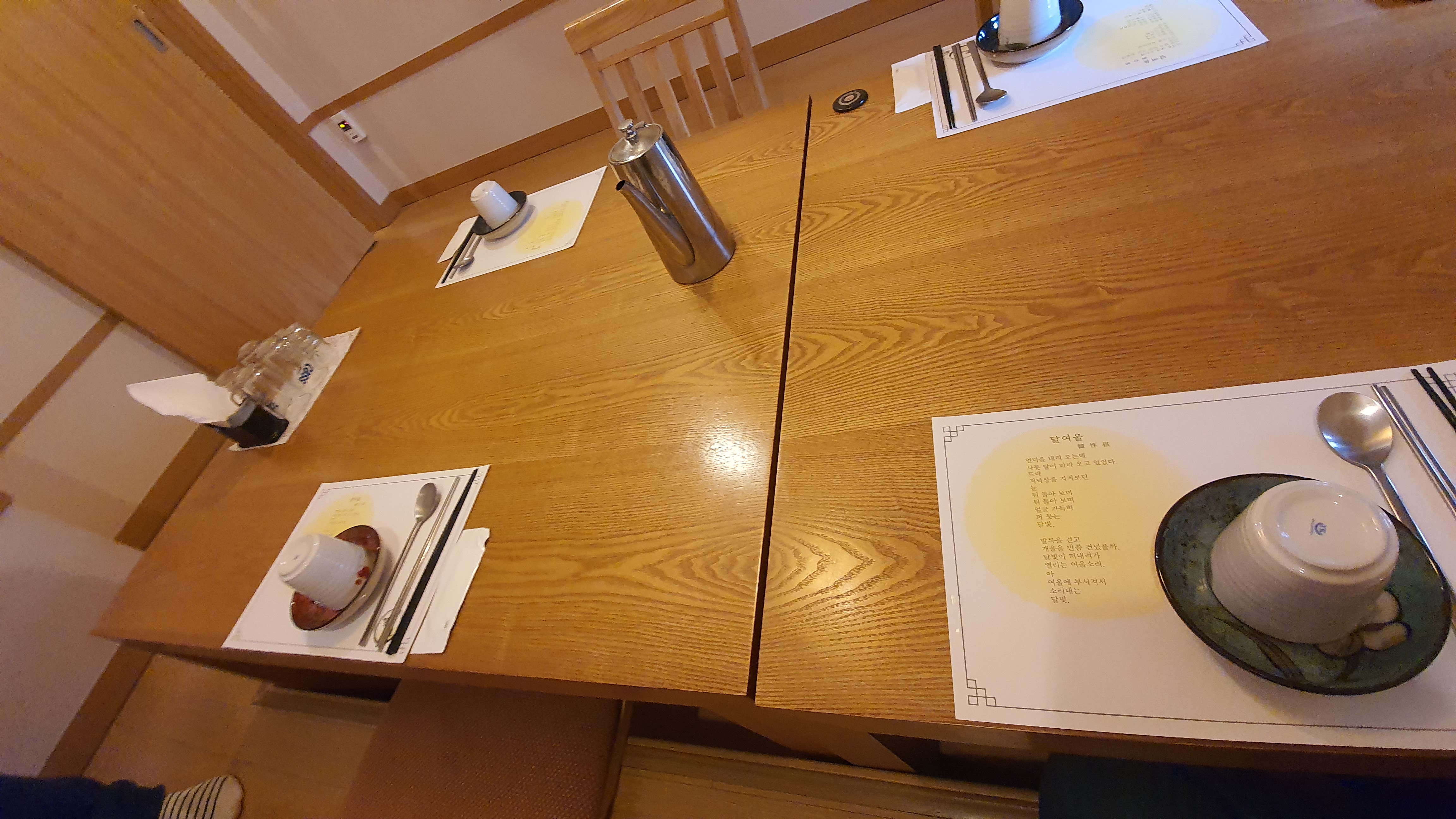 사당 한정식 맛집인 달여울은 오픈된 공간도 있지만 사전에 예약을 하면 이렇게 인원 수에 맞는 공간을 제공합니다. 상당히 깔끔하고 나름 방음도 잘되어 있는 편이기 때문에 상견례 혹은 중요 미팅을 하기에 좋은 곳이라고 생각합니다.