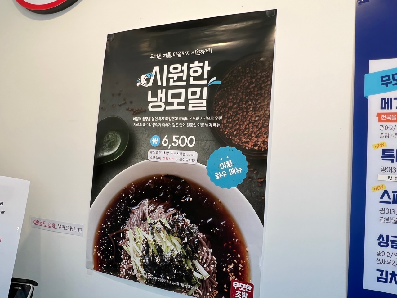 이런 포스터들도 붙어 있네요. 다음번엔 초밥먹을때 같이 한번 먹어봐야겠습니다. (집에 돌아와 인터넷으로 메뉴를 보니 냉모밀은 초밥 주문시에 주문이 가능하다고 합니다.)