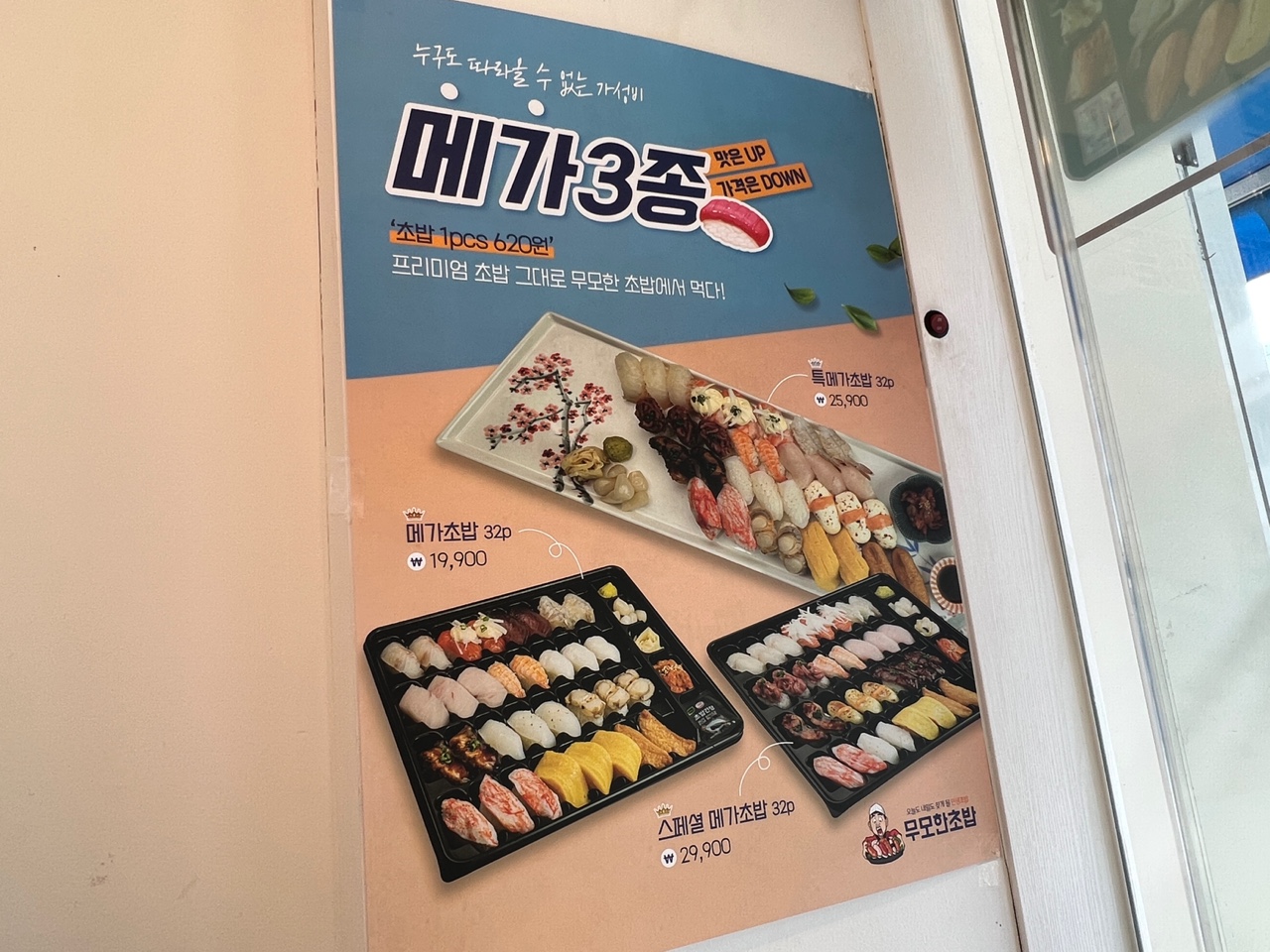 저는 가족과 함께 먹을거라 모듬초밥인 메가초밥을 먹기로 했는데요, 메가3종도 사진으로 한눈에 들어오게 되어 있어서 고르기 수월했습니다. 메뉴를 고른 후 키오스크에서 주문을 하고 잠시 기다리면 금방 초밥포장을 해주십니다.