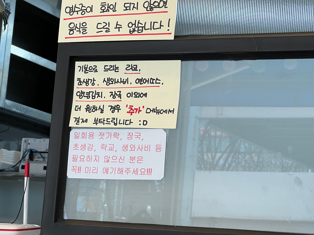 주문하고 카운터쪽을 보니 이런 안내문도 있네요. 집에가서 아쉽지 않도록 기호에 맞게 추가 혹은 필요하지 않는것은 미리 요청하시면 좋을 것 같습니다. 저는 집에서 먹을거라서 젓가락은 빼달라고 요청드렸습니다.
