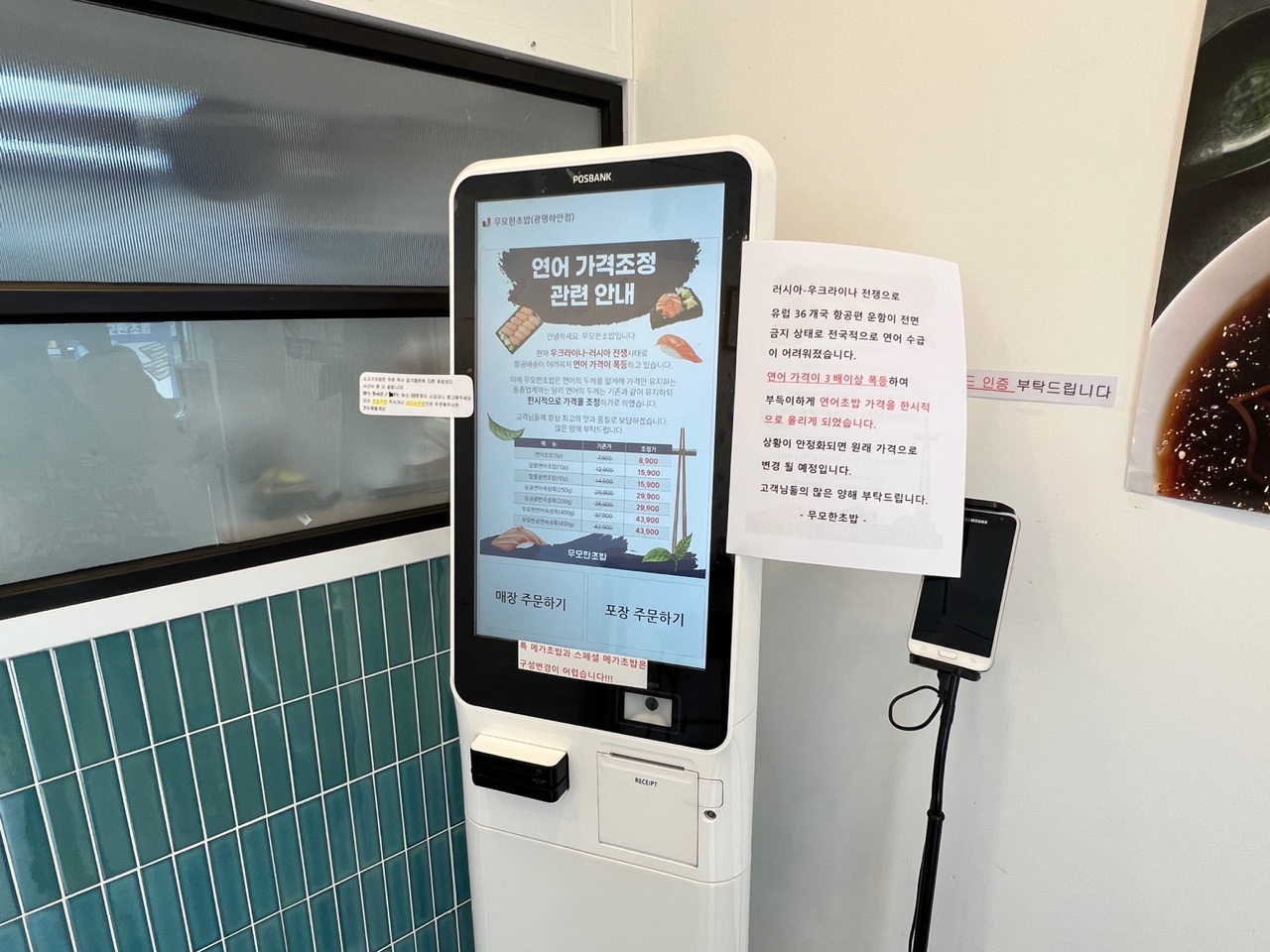매장에 들어가면 앉아서 기다릴 수 있는 의자와 직접 주문하게 되어있는 키오스크가 있습니다. 요즘 전쟁으로 인해 연어초밥의가격이 조정 되었다는 안내가 공지 되어 있네요.