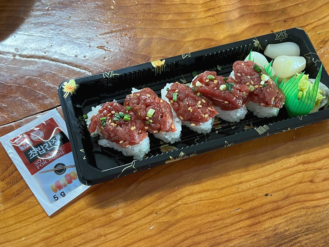 이건 추가로 주문한 육회 초밥5p 구성입니다. 간장, 와사이, 락교까지 넣어주셨습니다.
