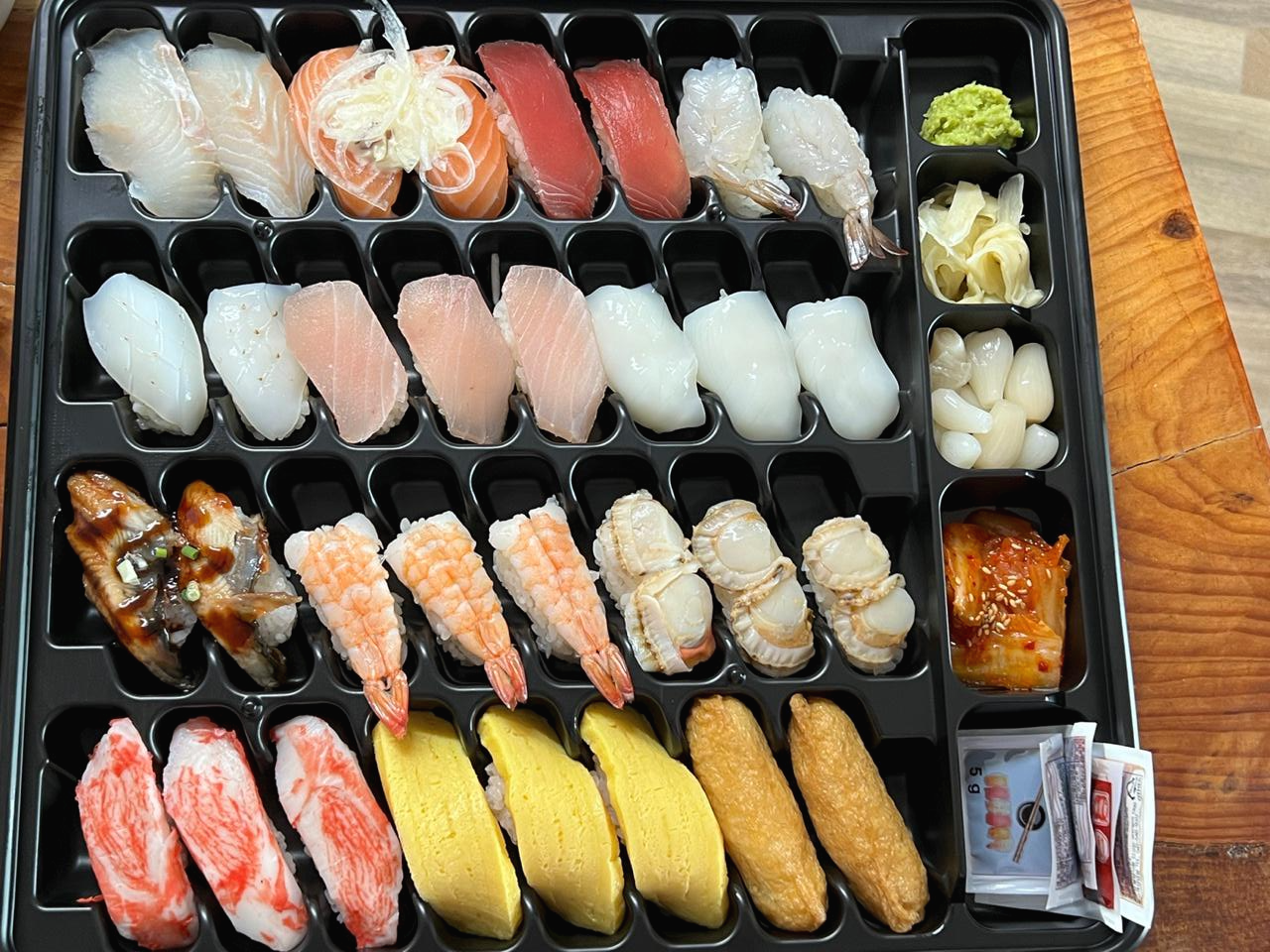 종류별로 가지런히 제자리에 들어있는 초밥들. 32P에 와사비, 생각초절임, 락교, 김치, 간장 이렇게 깔끔하게 포장되어있습니다. 이런 초밥포장상태 때문에 먹기전부터 늘 좋은 이미지를 갖게 되는 것 같아요. 전반적으로 음식 상태나 맛도 깔끔하게 조리 된 맛이어서 좋습니다.