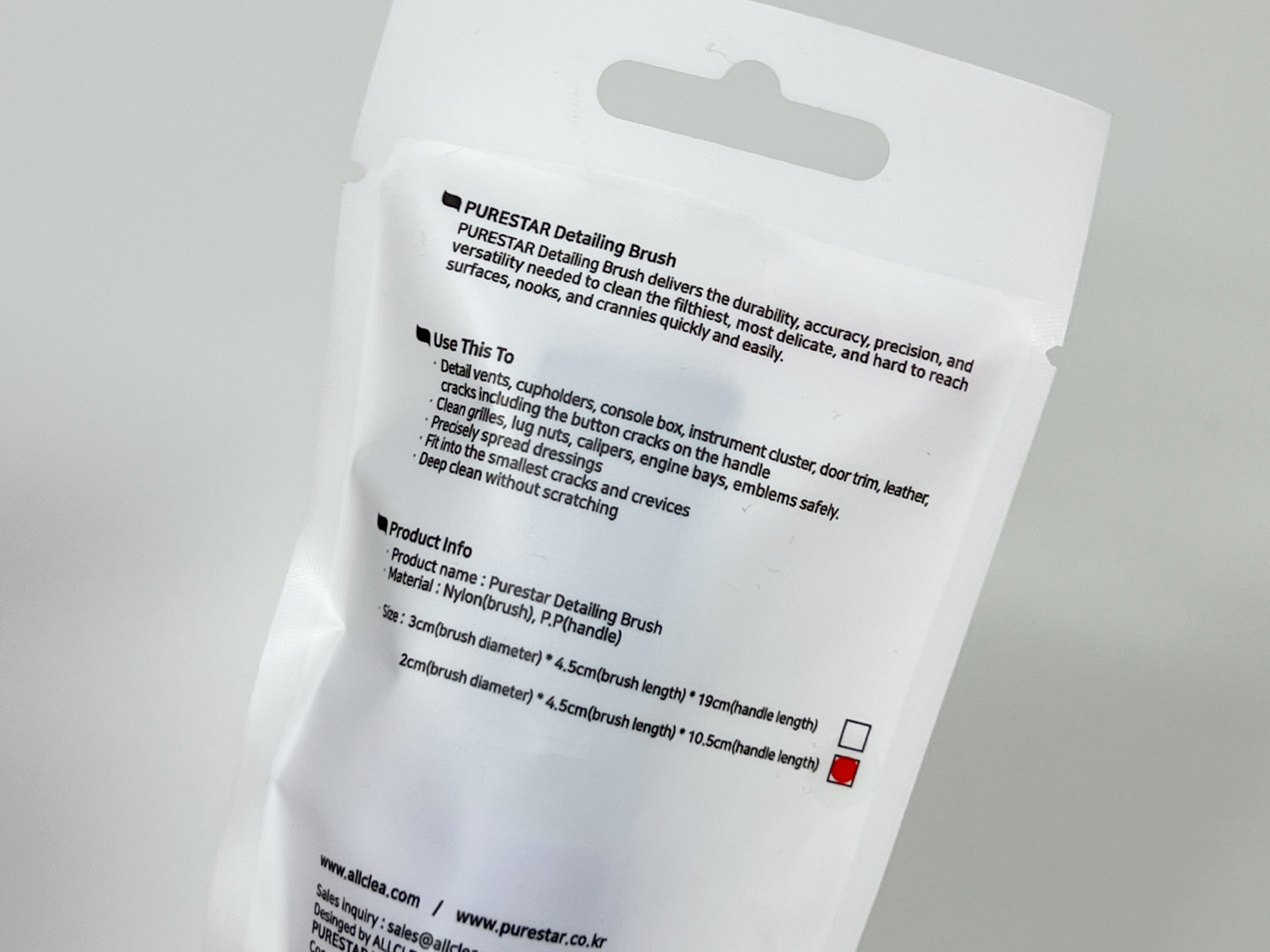 우선 퓨어스타 디테일링 브러쉬는 사이즈 대 / 중 두가지로 되어있는데 사용방법 또는 목적에 따라 원하는 사이즈를 선택하면 좋을 것 같습니다. 제가 사용하고 있는 사진의 브러쉬는 '중'사이즈 입니다.
