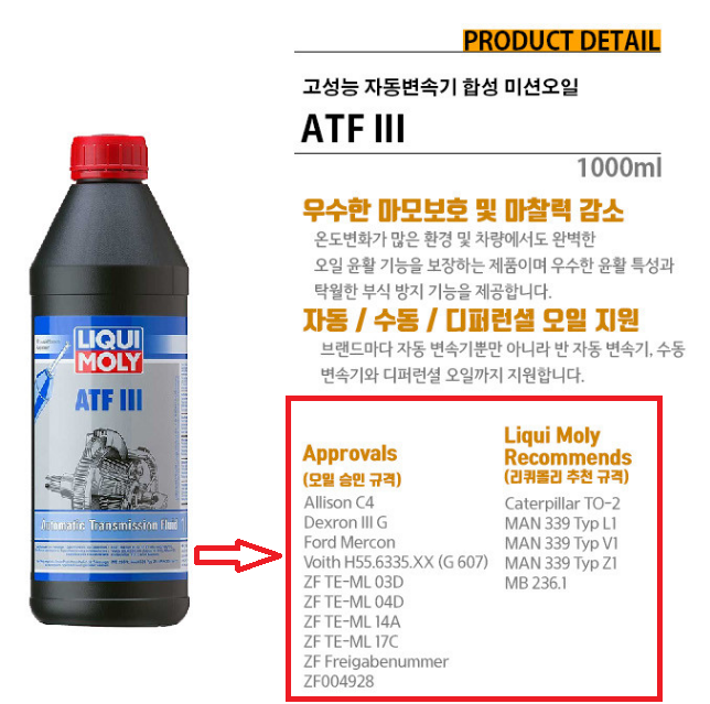 위의 ATF 오일 제품 이미지처럼 제품마다 승인규격/사용 추천 규격이 표시 되어 있는데요, 엔진오일과 마찬가지로 API규격 외에도 각 회사에서 지정한 규격 명칭이 있을 수 있기 때문에 차량 사용설명서의 권장 사항 또는 차량 서비스센터에서 차량에 맞는 규격을 정확히 확인하고 판매되는 제품에 표기된 규격들을 확인해 보면 내 차에 어떤 오일을 사용해야 하는지 알 수 있습니다.