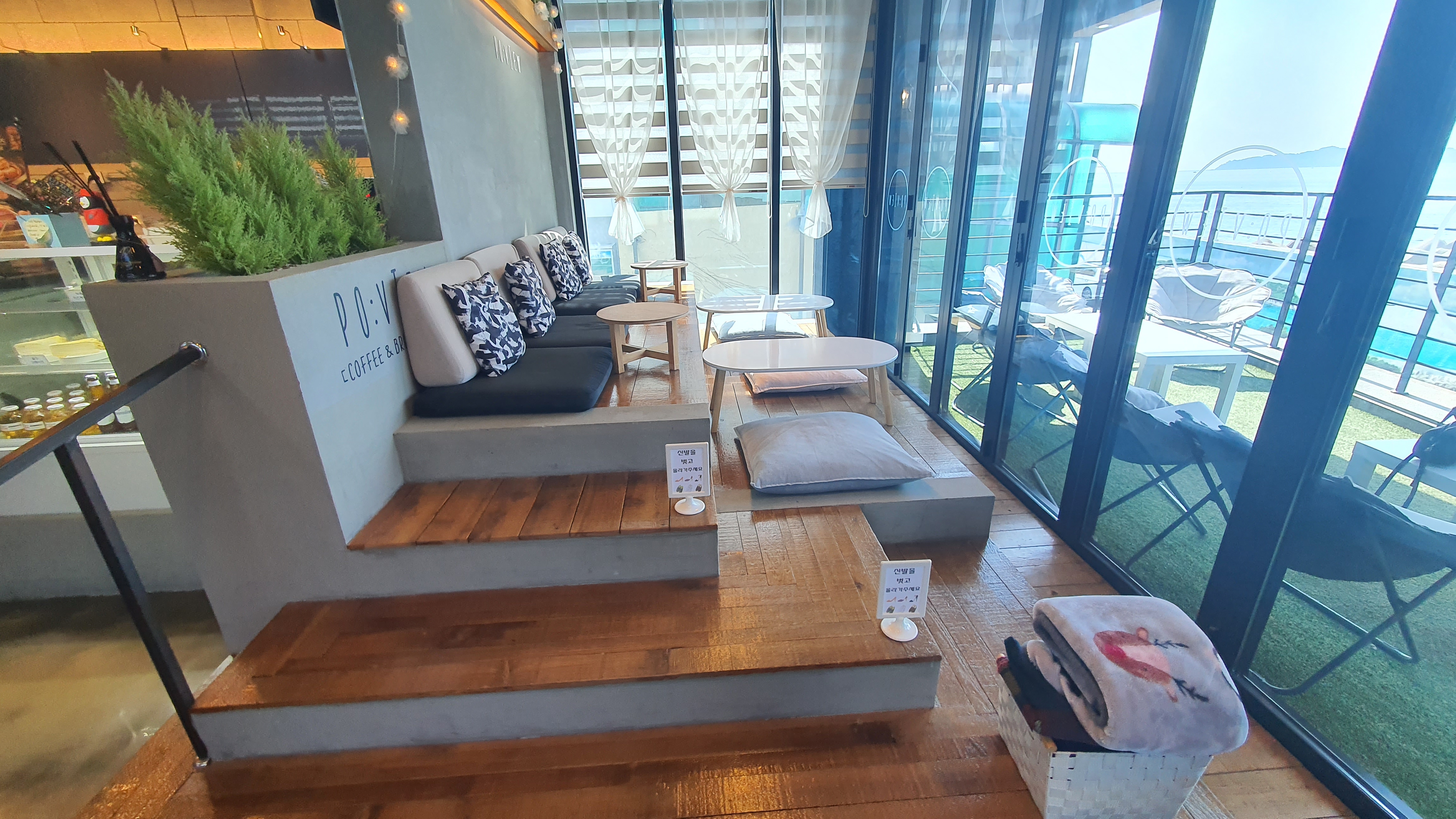 경치 좋은 카페 포뷰는 날씨 좋은 날에는 이렇게 테라스에 앉아서 커피를 마실 수가 있으며 비가 내려도 바닷가를 볼 수 있다는 점이 이 곳 거제 카페 포뷰에 특징 중 하나이다. 이 날은 날씨가 좋아서 밖에서 커피를 마시면서 바닷가를 멍하게 바라보는 점이 가장 큰 매력이였다.
