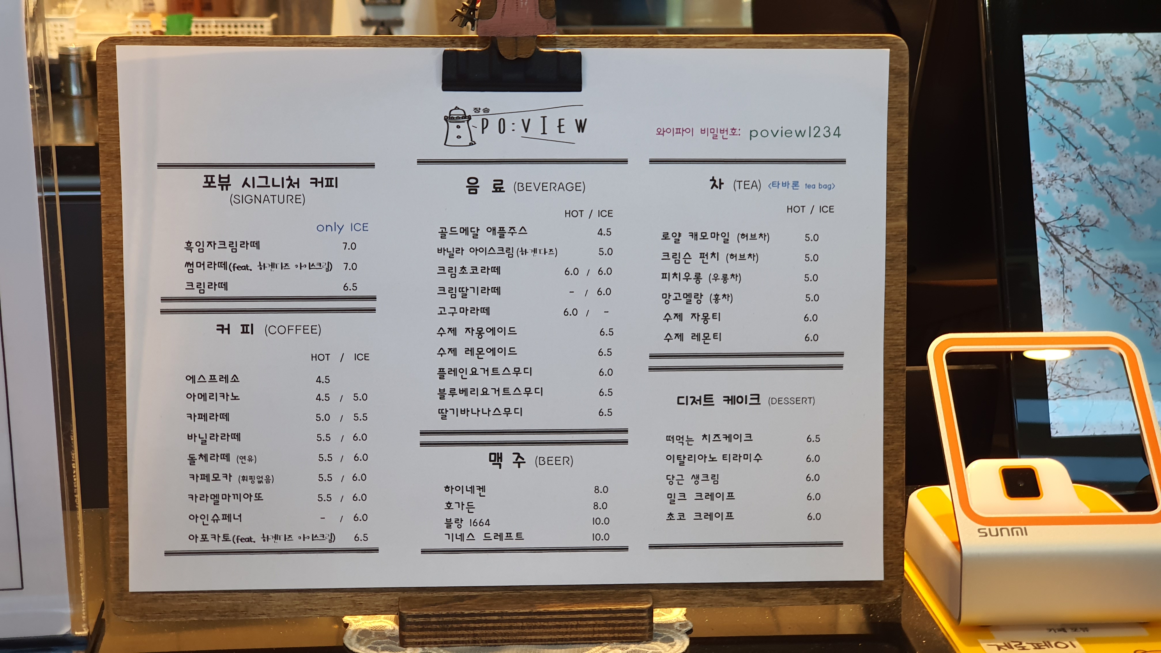 거제 카페 포뷰는 시그니처 커피로 흑임자 크림 라떼, 썸어라떼, 크림 라떼가 있으며 커피 뿐만 아니라 운전을 하지 않는다면 하이네켄이나 호가든 한 병으로 지중해에서 맥주 마시는 듯한 느낌을 줄 수도 있다.