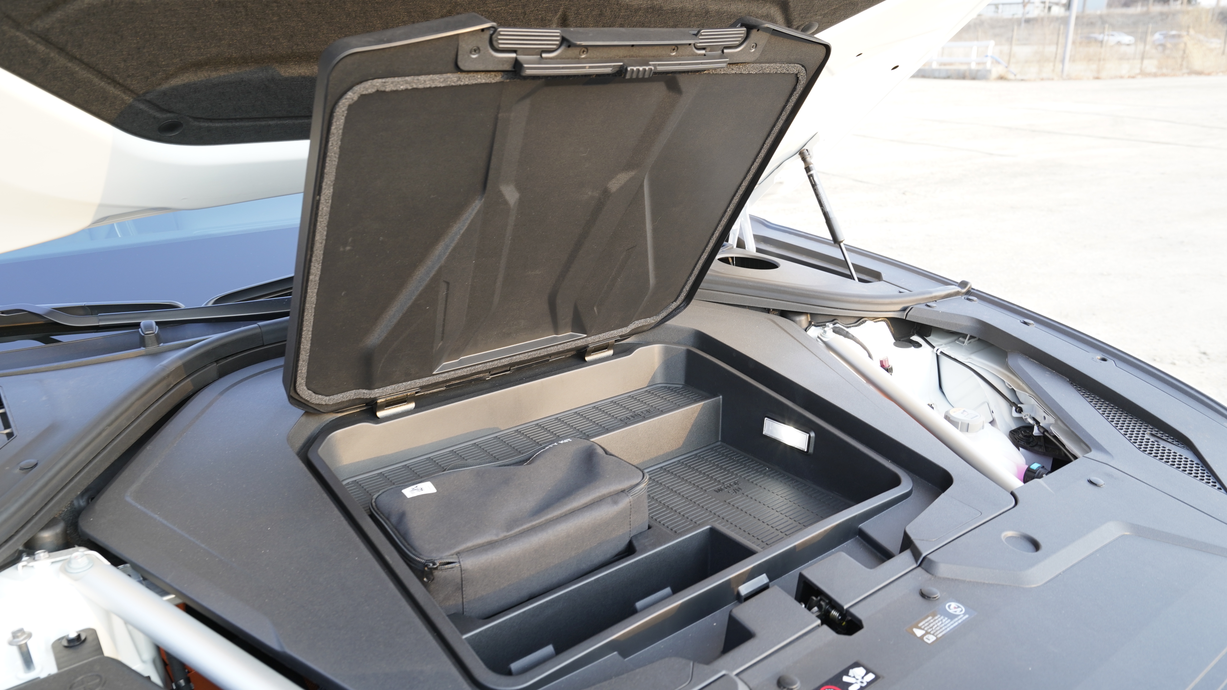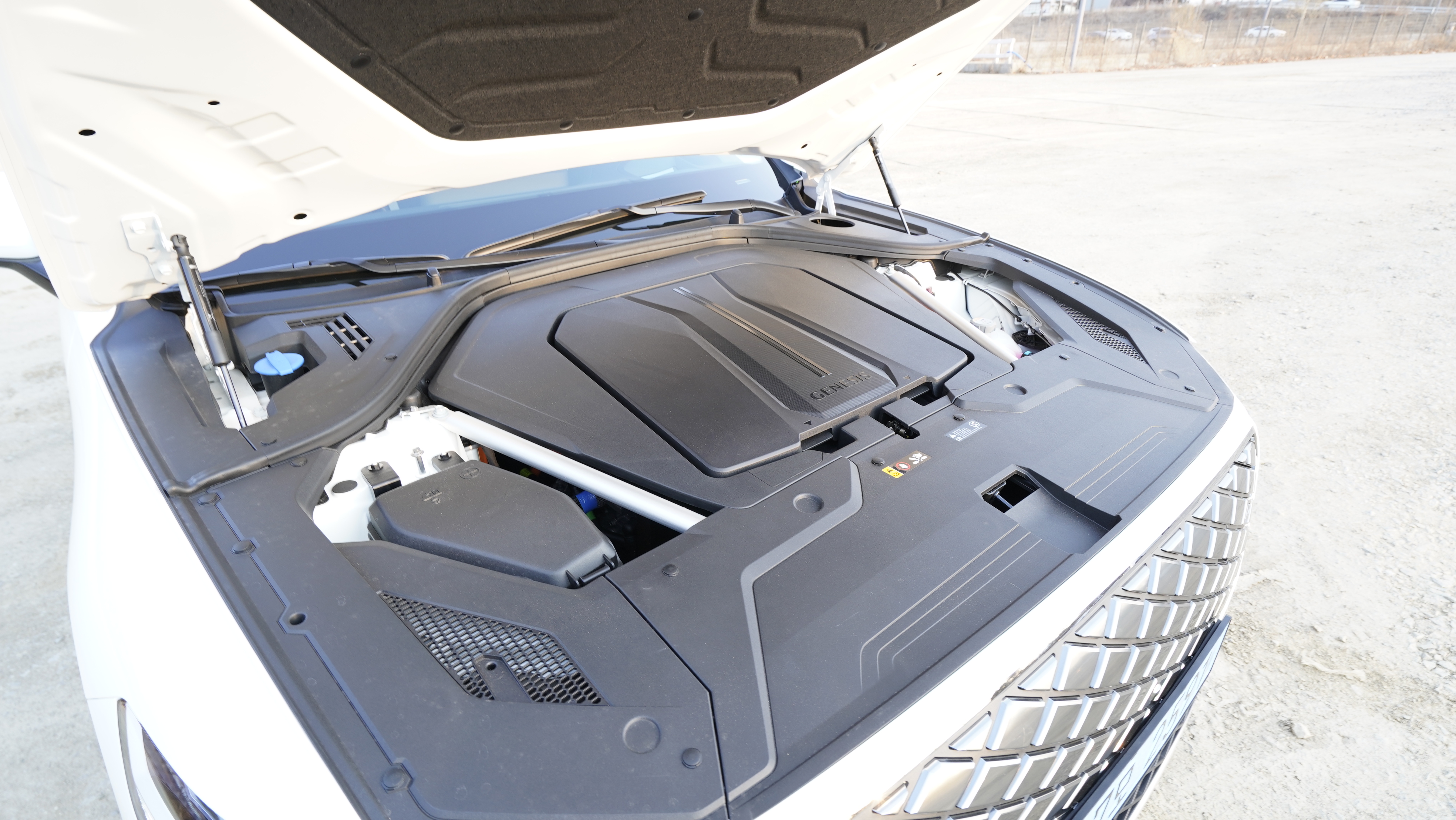 차량 본넷을 열면 엔진이 위치했던 부분에는 엔진과 비슷하게 생긴 작은 수납 공간을 보여준다. 전기차 전용 플랫폼 GV60 모델의 수납공간과 비교하더라도 아주 큰 차이는 없는 것이 특징이며 전륜 모터가 추가되어 아이오닉5 기본 모델의 수납공간과 비교하면 차이가 있다.