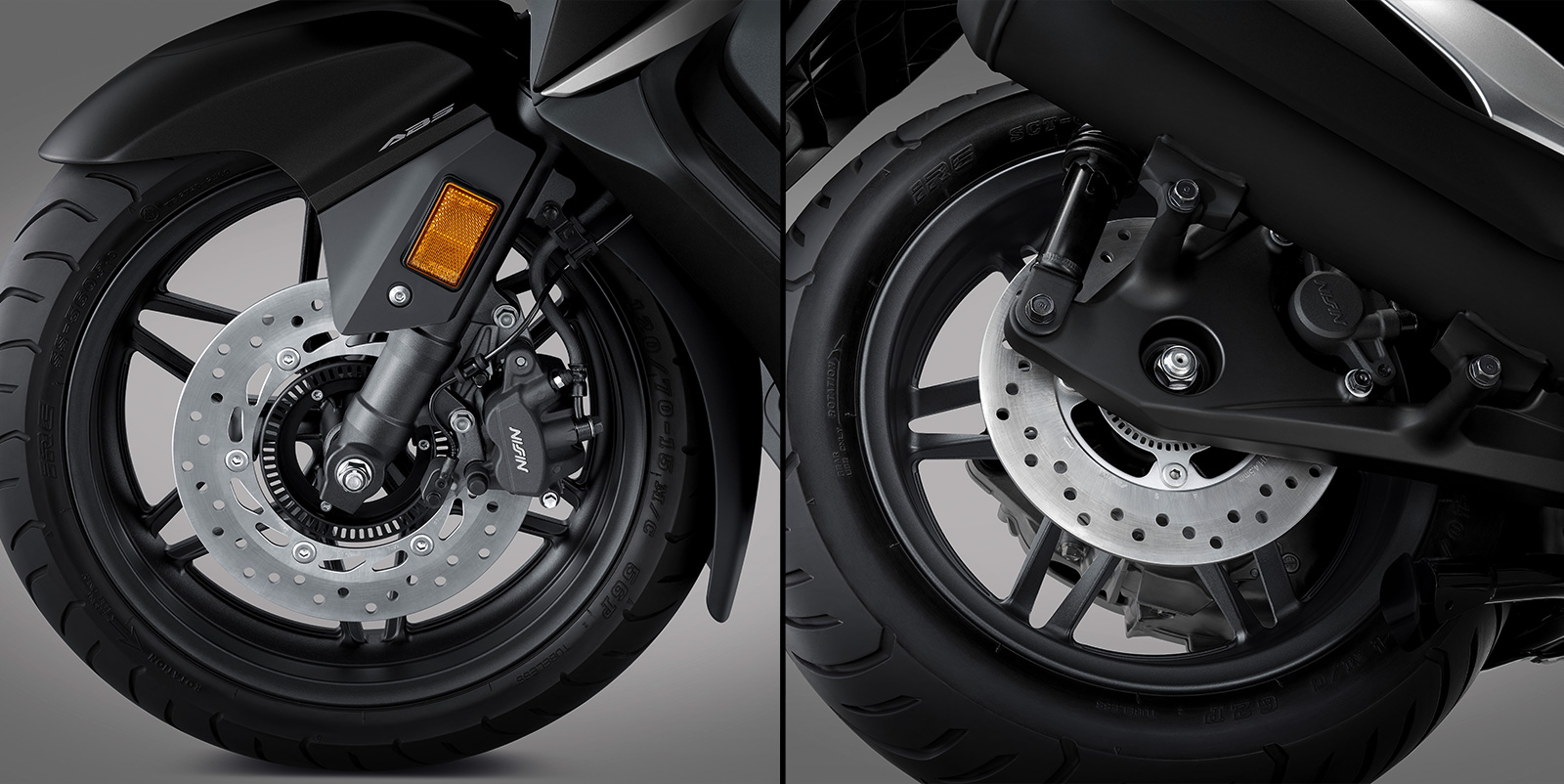 브레이크는 프런트 256mm, 리어 240mm 디스크를 채용해 다양한 노면 상황에서 충분한 제동력을 확보하고 프런트와 리어 모두 작동하는 2채널 ABS를 탑재해 급제동이나 비기오는 미끄러운 노면에서도 안심하고 브레이크를 사용할 수 있다.