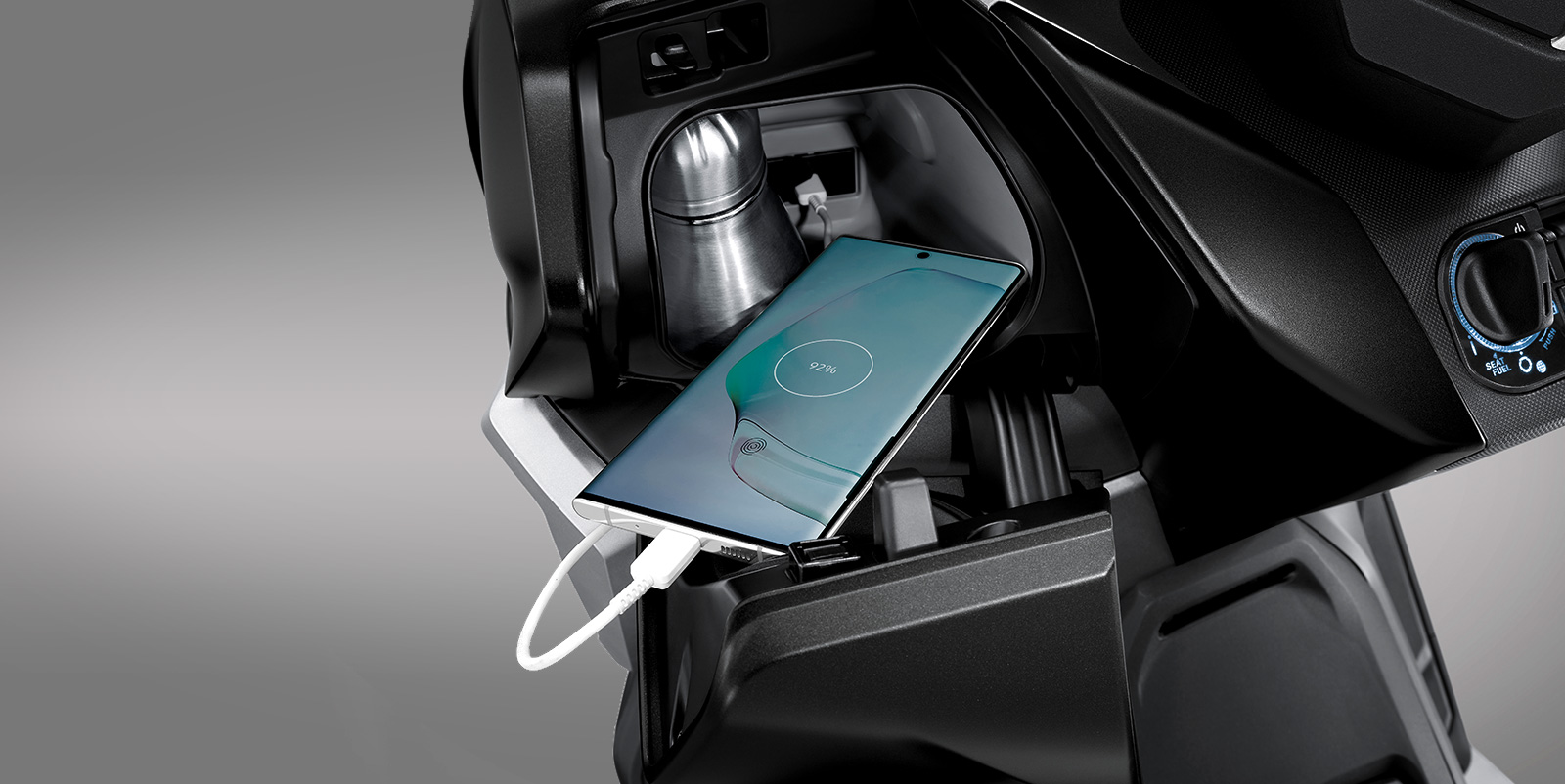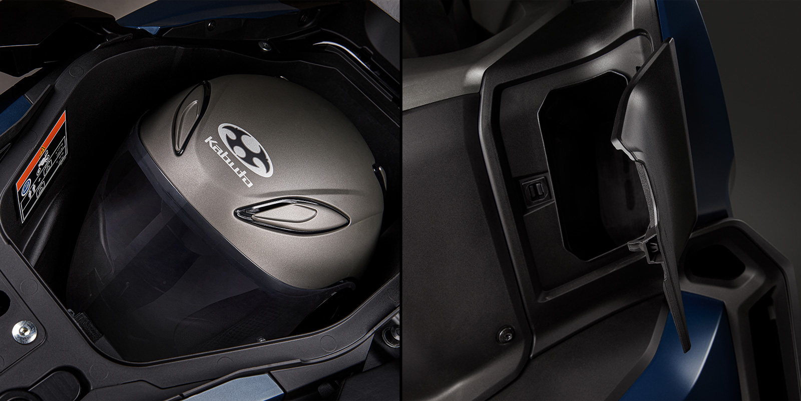 수납공간으로는 풀페이스 헬멧 2개가 수납가능한 48L 대용량의 러기지 박스, 스마트폰 충전이 가능한 USB 소켓이 있는 4.5L 프런트 이너박스가 탑재되어있다.
