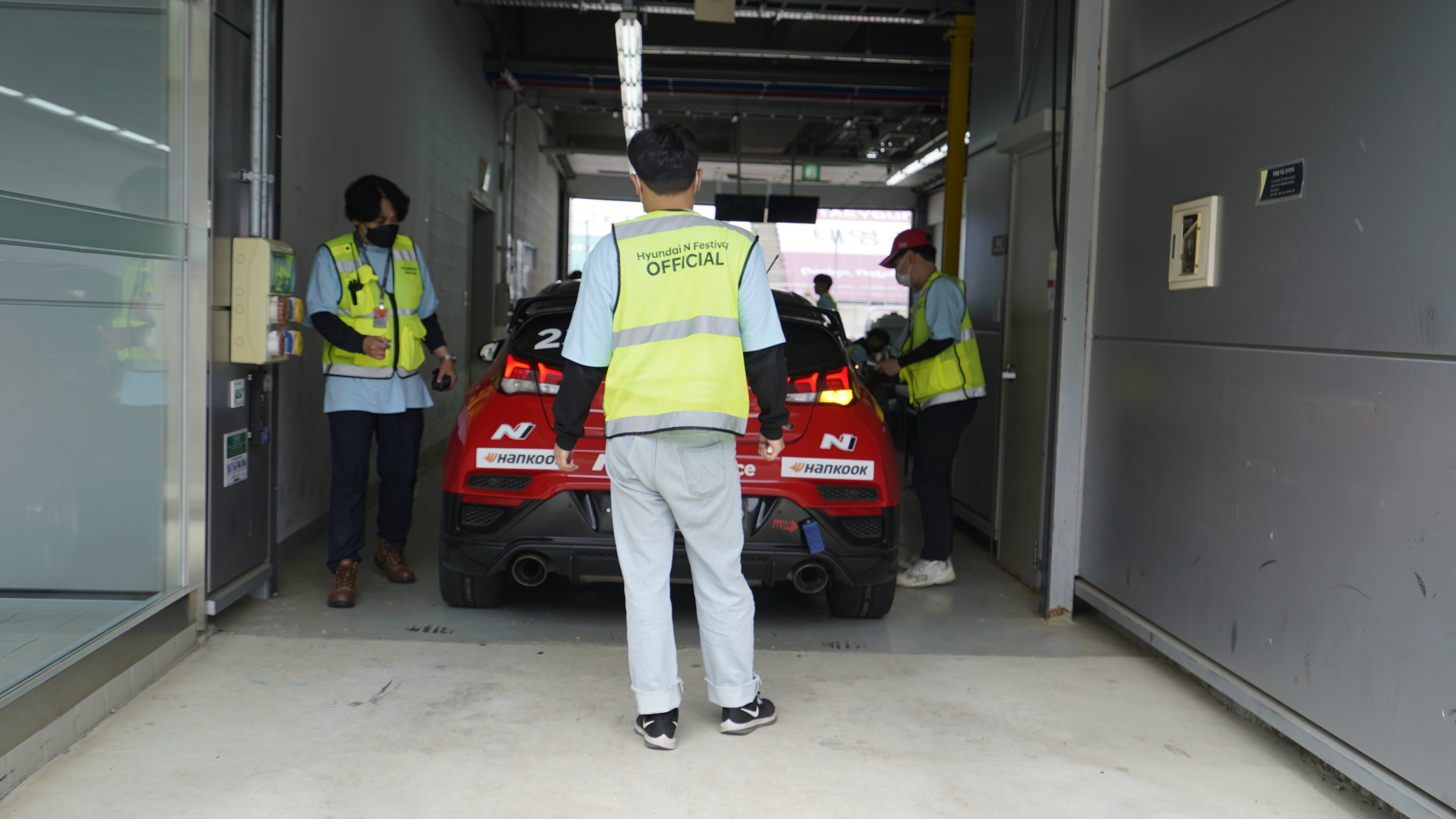레이스를 준비하면서 차량에 문제가 없는지 혹은 규정에 맞는 튜닝을 했는지를 검사하는 검차 과정을 꼭 거쳐야 대회에 참가할 수가 있으며 현대 N 페스티벌의 원메이크 타이어인 한국타이어는 현장에서 레이스 타이어를 장착하는 모습도 볼 수가 있습니다.