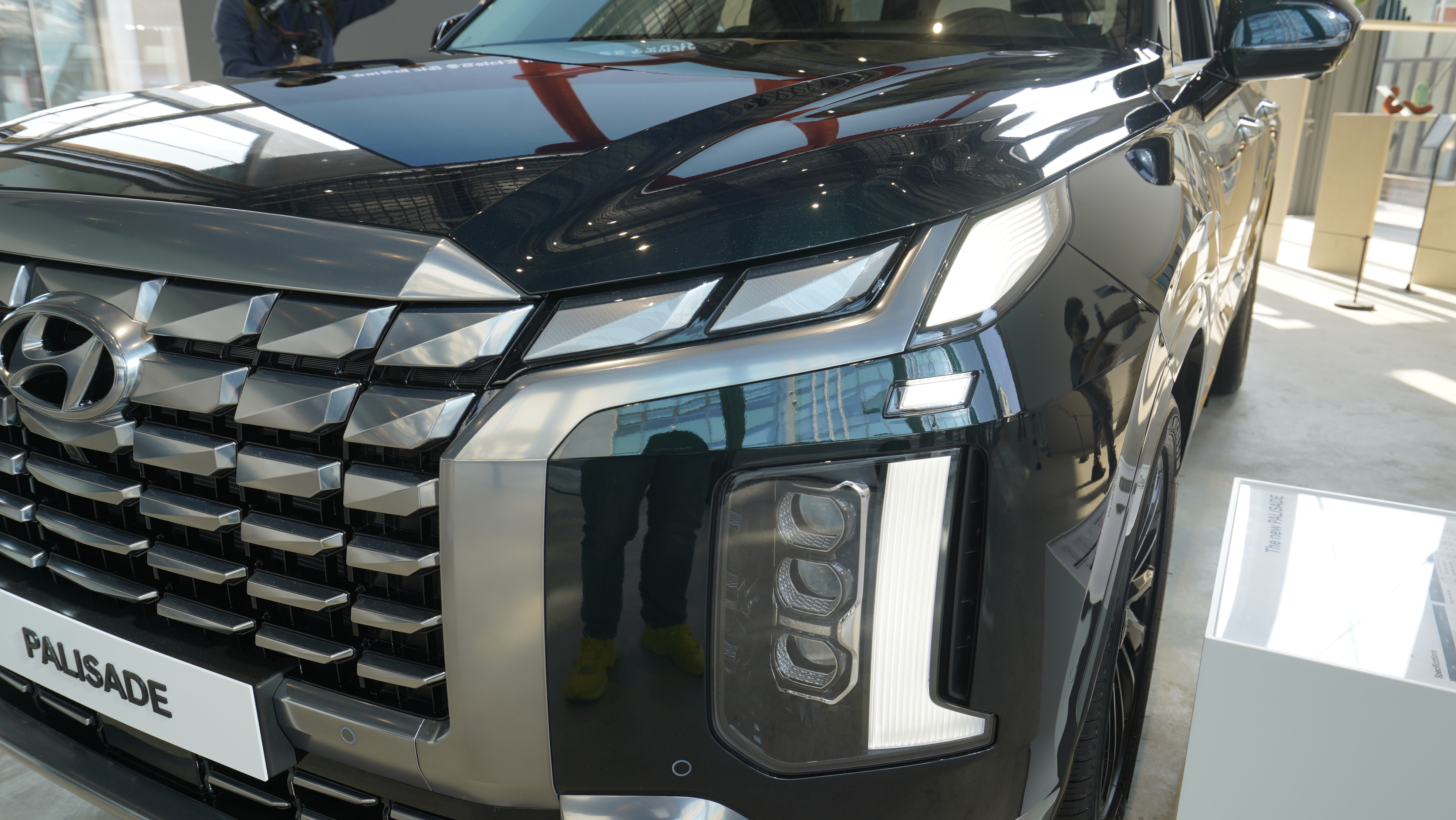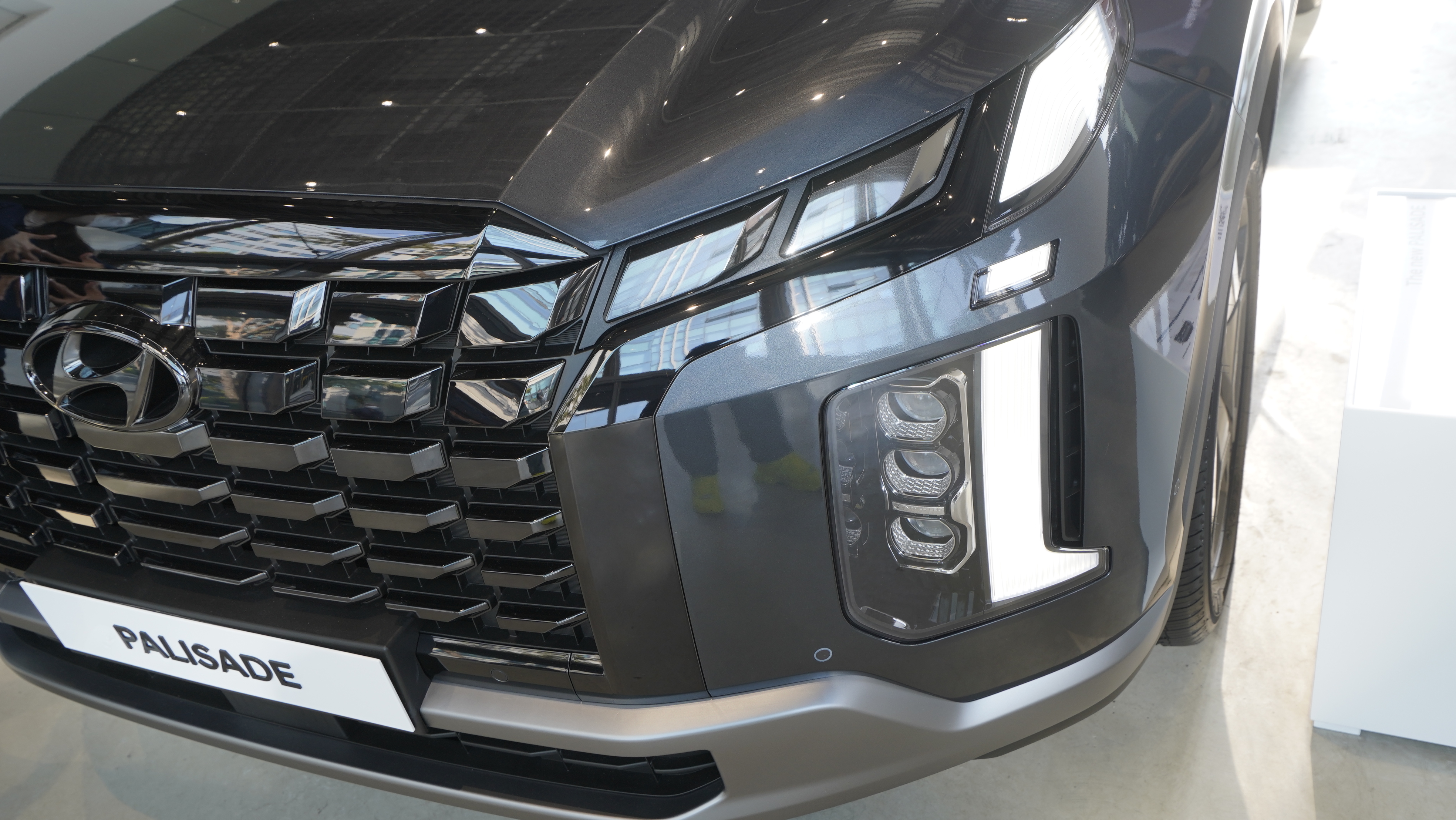 전면부 디자인은 좀 더 넓어진 캐스케이드 그릴이 돋보인다. 그릴과 주간주행등 DRL 그리고 헤드램프가 하나로 이어지는듯한 디자인으로 좀 더 강인하고 차량이 웅장하게 보여주는 느낌을 보여준다. 사실 차를 아주 잘 아는 사람이 아니라면 뭐가 바뀐 건가?? 할 수도 있겠지만 구형과 나란히 비교해놓고 보면 상당히 인상적으로 바뀌었다는 사실을 알 수가 있다. 언 듯 투싼 신형 모델과 비슷하지 않을까? 걱정했지만 실제로 꽤 괜찮은 비율로 잘 어울리는 편이었다. 또한 일반 모델은 블랙 유광으로 그릴을 마무리했고 최상위 등급인 캘리그래피 등급은 무광 크롬으로 마무리했다. 젊은 층은 확실히 블랙 무광 컬러의 캘리그래피 아랫 등급을 더 선호할 것으로 보이는데 실질적으로 팰리세이드 구매층의 연령대가 40대 > 50대 > 30대 순이기 때문에 이를 고려한 것으로 보이고 있다.