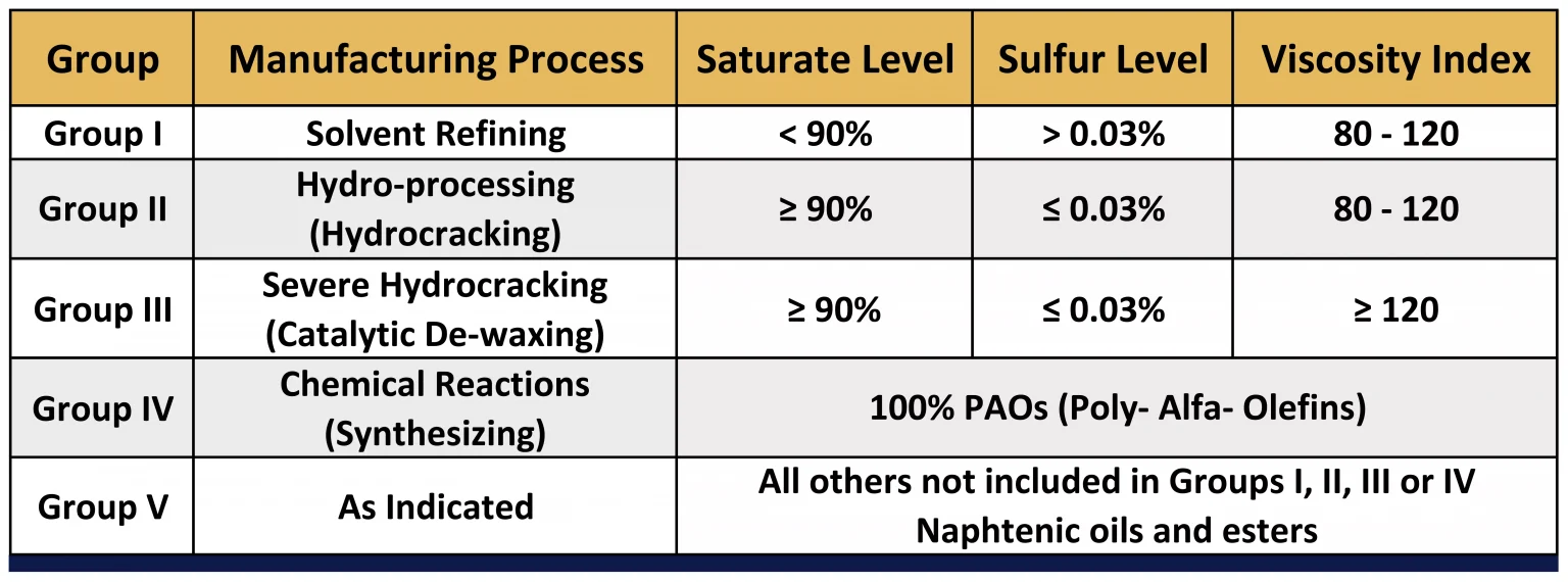 엔진오일의 기유 분류에 따라 광유 <VHVI, XHVI <파오(PAO)<에스테르로 정립된다.