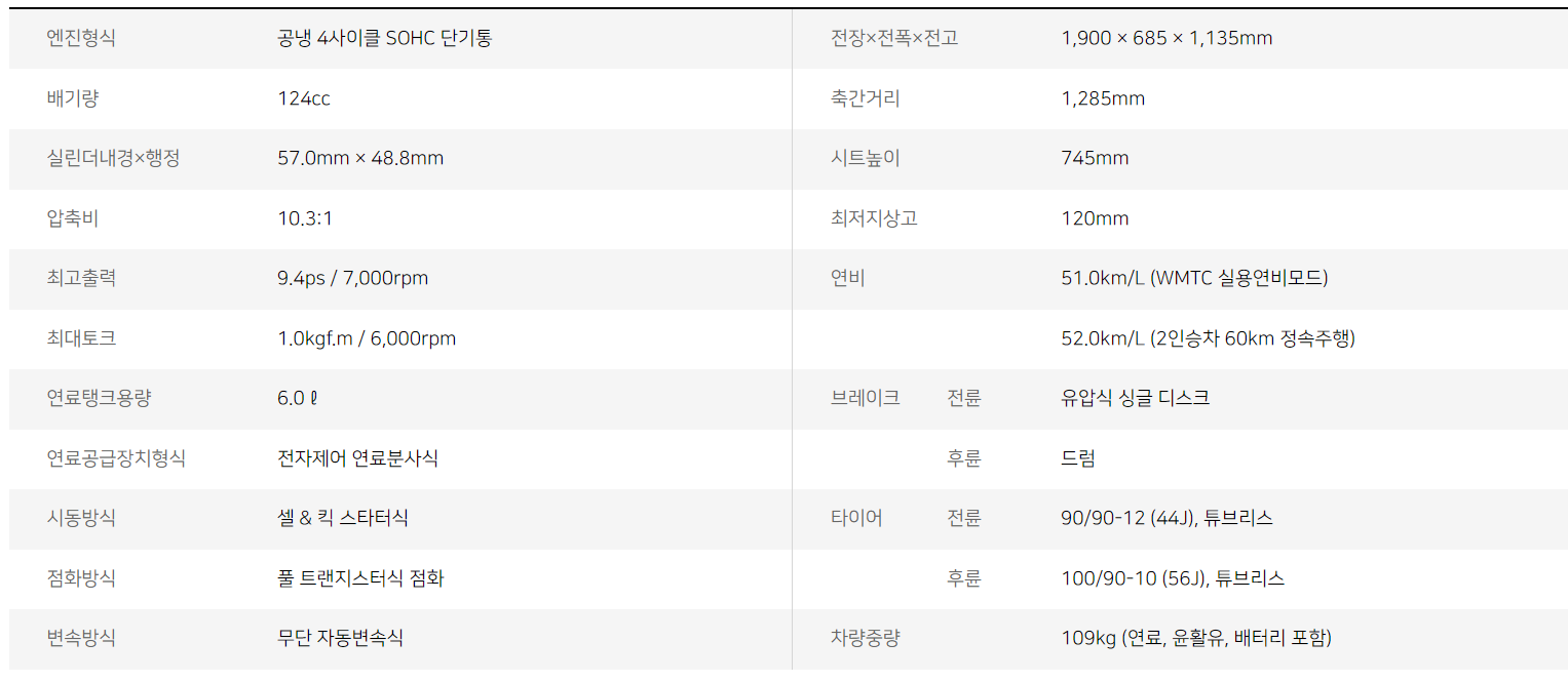 | 배기량 | 125cc | 축간거리 | 1,465mm |