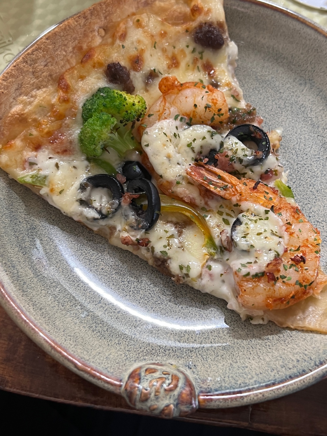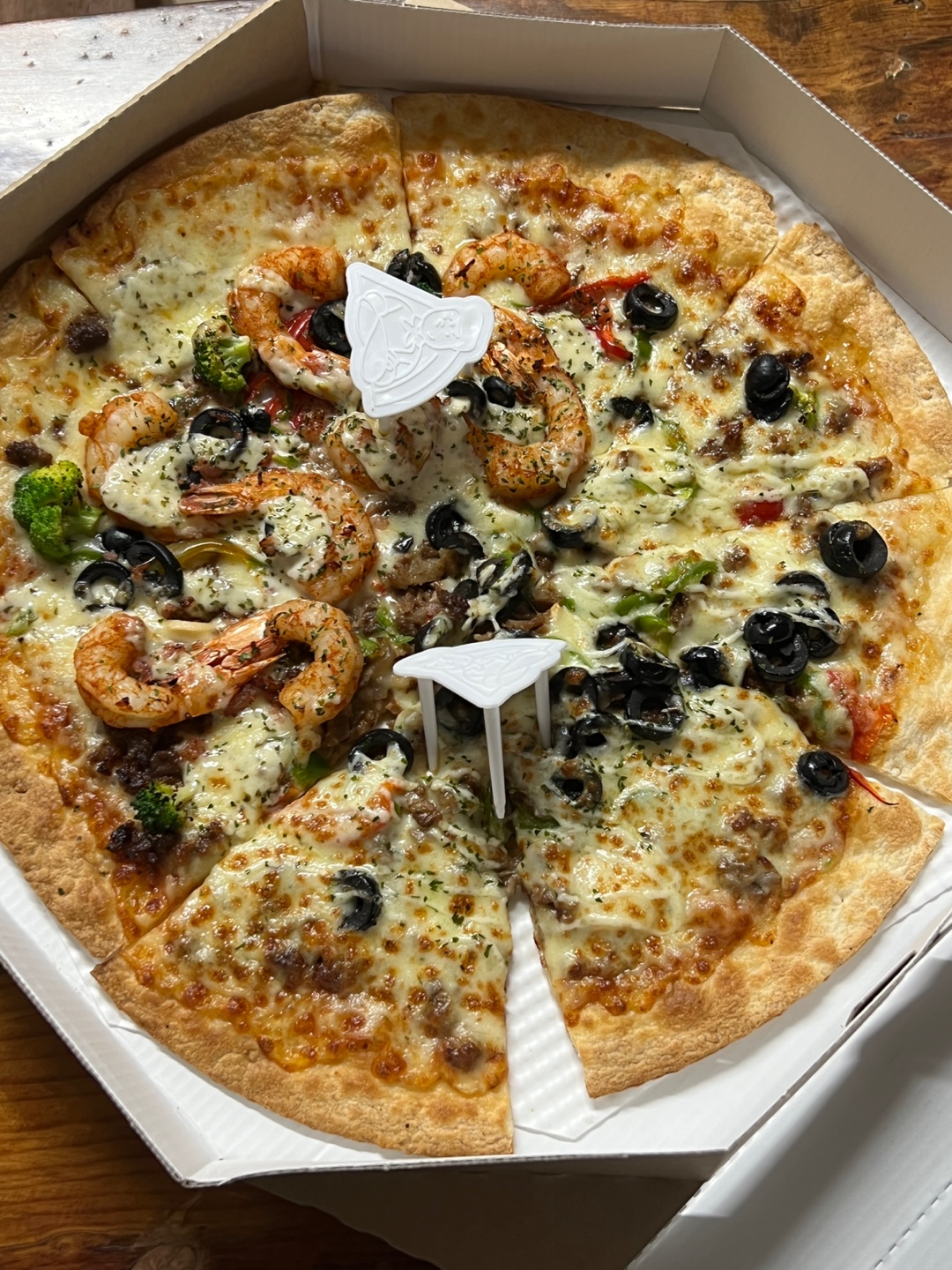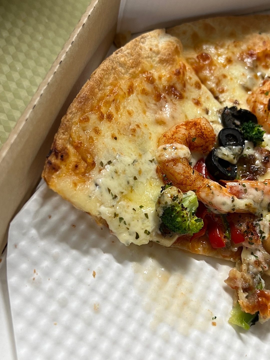 큰 새우가 듬뿍 올라간 킹 쉬림프 맛 피자 입니다. 간이 벤 새우와 크리미한 소스가 함께 어우러져 부드러운 맛이 나지만 느끼하진 않는 깔끔한 맛의 메뉴 입니다. 새우 좋아하신다면 추천 합니다.