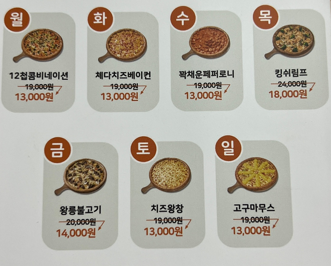 매장 사진에서 보셔서 이미 아셨겠지만 방문 포장을 할 경우 5,000원을 할인해주고, 요일마다 정해진 피자가 할인가로 판매 됩니다. 그래서 잘 알고 이용하면 저렴한 가격에서 훨씬 더 저렴하게 이용 할 수 있어서 좋습니다.