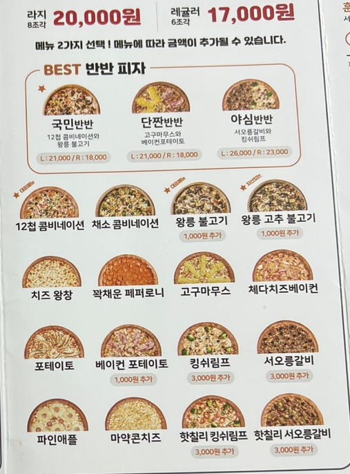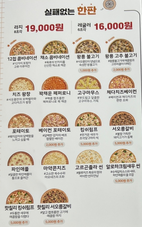 서오릉피자는 라지사이즈가 19,000원 부터 시작 되는 가성비 피자입니다. 게다가 '우리 입맛'이라는 타이틀을 내세우고 있는데요. 불고기 피자, 갈비피자 같은 메뉴 이름에서 알 수 있듯이 가족들이 모두 맛있게 즐길 수 있는 메뉴들로 구성 되어 있습니다.