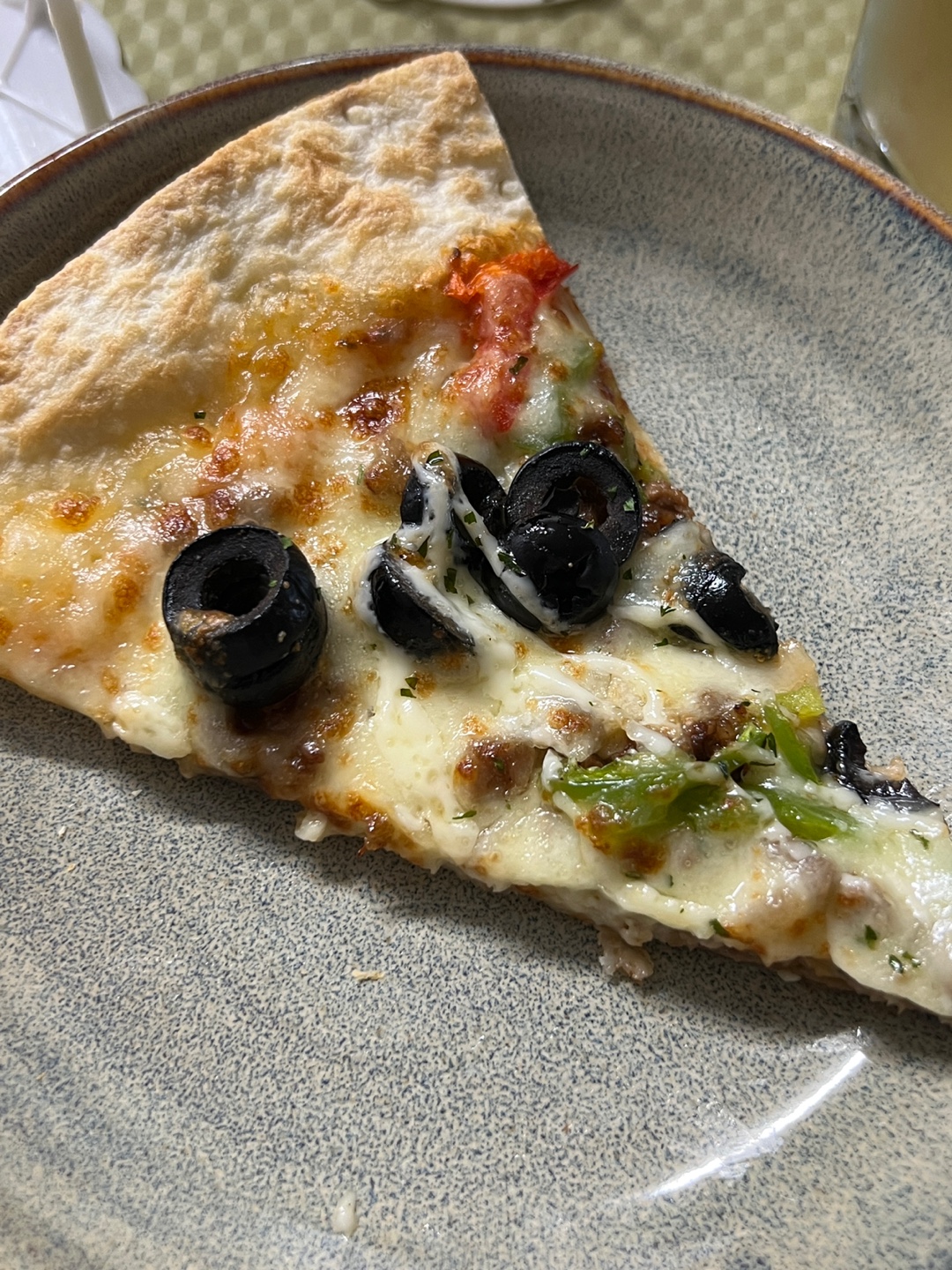 그런데 솔직히 딱 보자마자는 고기가 별로 없는데? 라는 생각이 들었는데요. 고기가 조금 올라와 있는 부분의 치즈를 조금 들춰보니 안쪽으로 다진 고기 토핑이 숨겨져 있었습니다. 그래서 막상 먹으면 덩어리진 고기의 토핑은 아니지만 한입 먹을때마다 고기토핑이 꽤 씹힙니다.