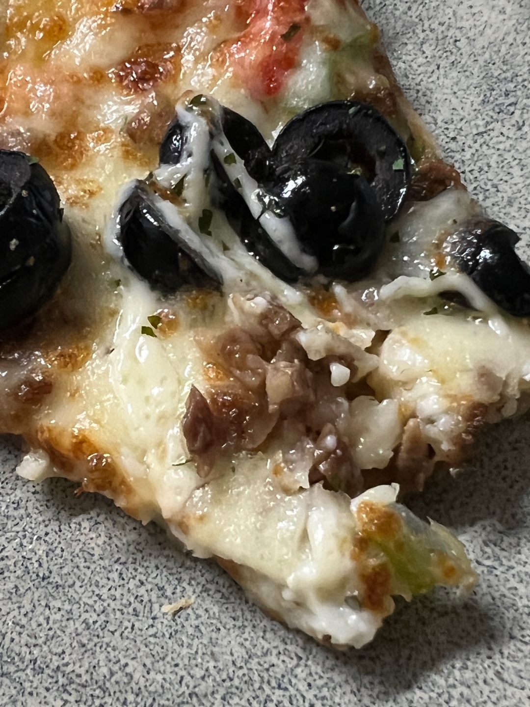 그런데 솔직히 딱 보자마자는 고기가 별로 없는데? 라는 생각이 들었는데요. 고기가 조금 올라와 있는 부분의 치즈를 조금 들춰보니 안쪽으로 다진 고기 토핑이 숨겨져 있었습니다. 그래서 막상 먹으면 덩어리진 고기의 토핑은 아니지만 한입 먹을때마다 고기토핑이 꽤 씹힙니다.