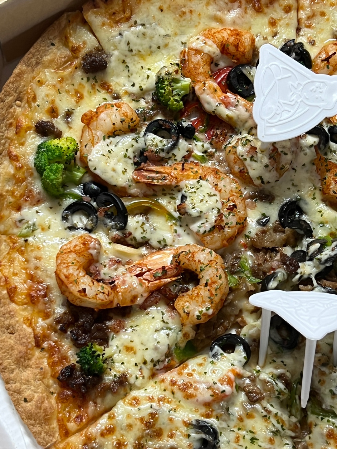 큰 새우가 듬뿍 올라간 킹 쉬림프 맛 피자 입니다. 간이 벤 새우와 크리미한 소스가 함께 어우러져 부드러운 맛이 나지만 느끼하진 않는 깔끔한 맛의 메뉴 입니다. 새우 좋아하신다면 추천 합니다.