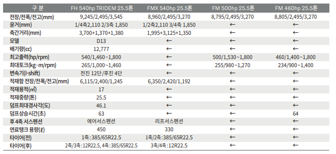 2010년부터 상용차 시장에서 선보였으며, FM시리즈 비해 지상고를 높이고 차대를 강화하는 등 험로 주파에 특화된 모델이다. 특성상 주로 건설장비인 덤프, 믹서트럭에 사용되어진다.