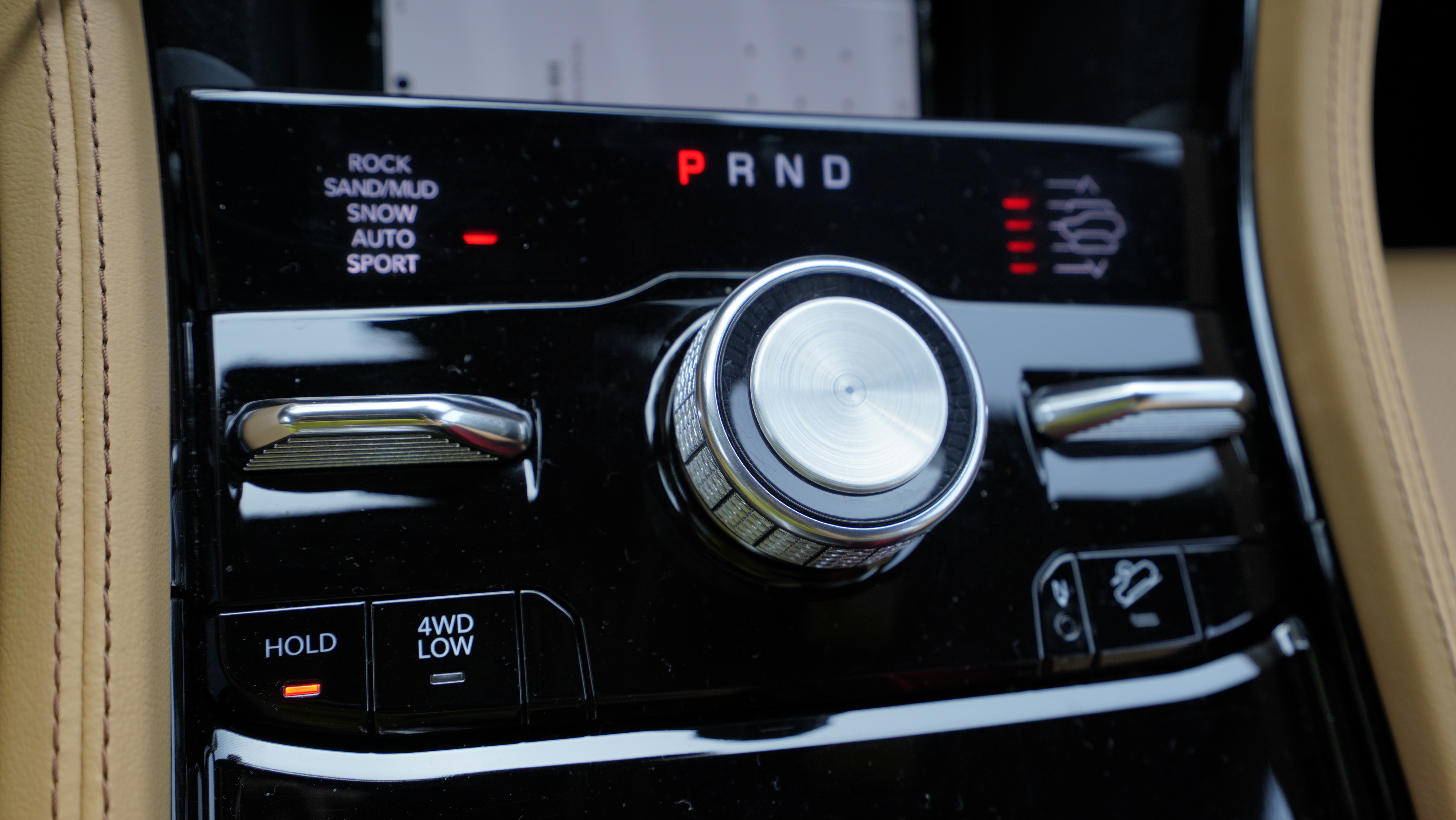 기어 변속기는 다이얼 방식으로 구성되어 있으며 바로 옆에는 드라이브 모드를 선택할 수가 있다. 차량 성격에 맞게 드라이브 모드는 오토 / 스포츠 / 터레인 모드인 스노우,샌드,머드,락 으로 단순하게 구성되어 있어서 크게 선택하지 않고도 오토 모드가 알아서 해준다. 또한 총 5단계의 에어 서스펜션의 차고조절 버튼은 다용도로 활용할 수가 있으며 오토 모드에서 자동으로 차고를 내리고 올려서 정말 편리하다.