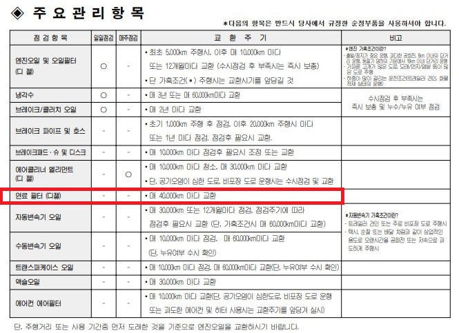 특히 디젤(경유)의 경우 가솔린(휘발유)보다 수분을 더 잘 흡수하는 성질이 있어 연료필터 교체주기가 너무 늦지않도록 관리에 특히 더 신경을 써야 합니다.