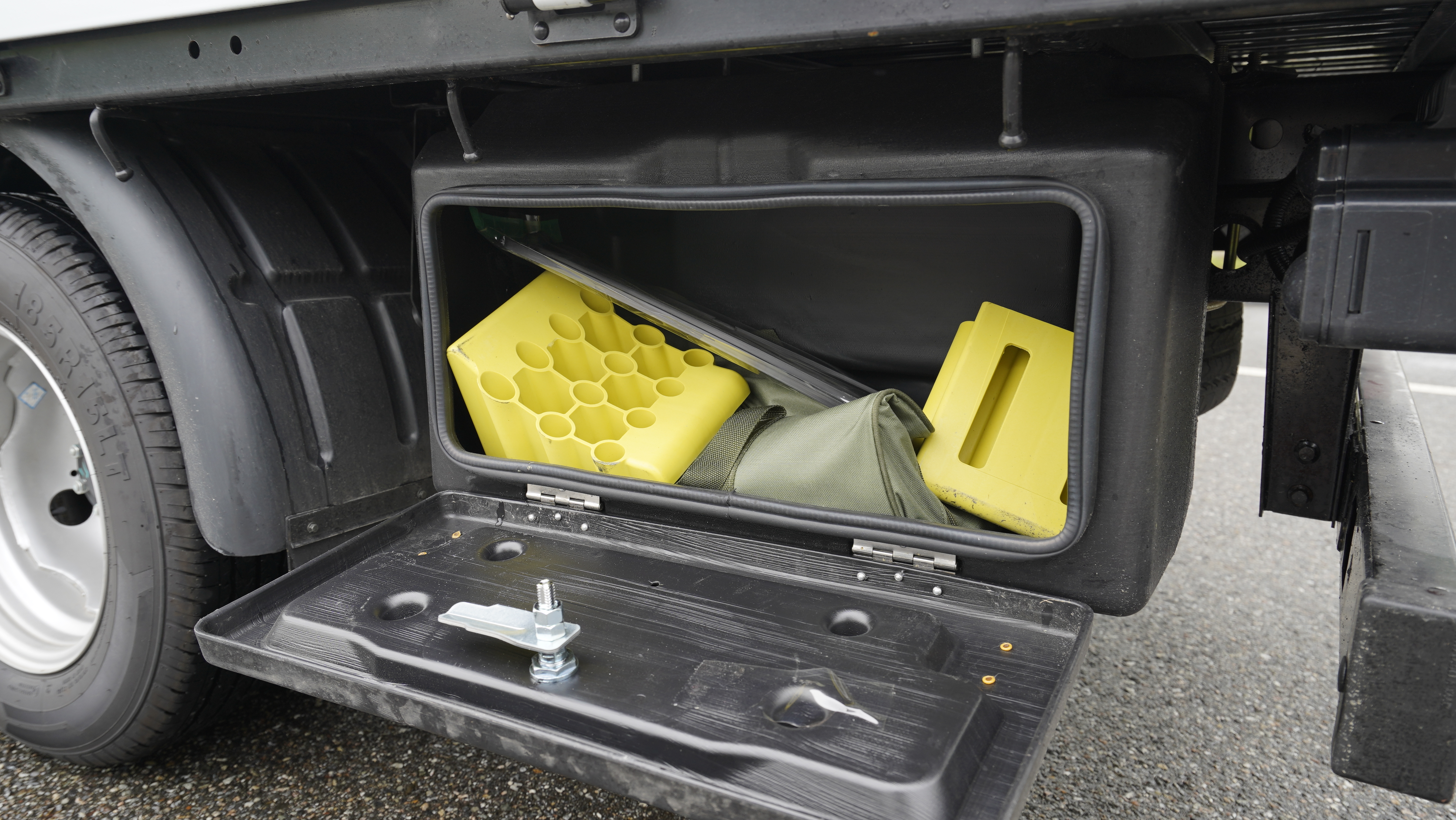 젤라EV가 겉으로 보면 편의 기능 같은 장점이 많이 없어보인다. 우선 이 차량은 화물 전기차 즉 화물 운송이 먼저인 차량으로 차량 외부에 포터EV에서 볼 수 없는 대형 공구함을 기본 장착했다. 여기에 차량 내부에 꽤 많은 수납 공간은 장시간 주행하는 운전자들에게 편의성을 제공하고 특이하게 차량 순정 매트가 코일 매트를 적용하고 있어 흙먼지가 많은 곳에서 일하는 분들에게 좋다. 여기에 총 2인승으로 허가가 되어 있지만 중간 시트를 접고 펼 수 있으며 ECM 하이패스 룸미러까지 기본 탑재되어 있다.