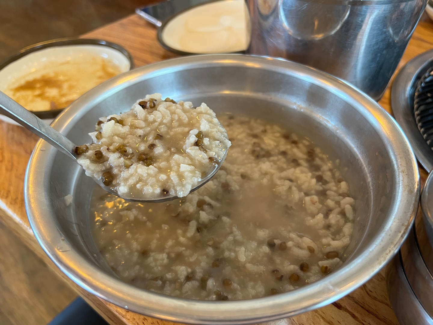 다 먹어갈때쯤 직원분이 죽 드릴까요? 하고 물어보고 녹두 죽을 주시는데요. 다음에가면 먼저 요청드리고 고기랑 같이 먹어도 좋을것 같다는 생각이 들었습니다. 고기랑 따뜻하고 부드럽게 먹으면 좋을것 같기도 하고, 만약 음식이 남은경우 포장을 해주시는데 죽은 국물류라서 포장이 안되기 때문인데요. 식성에 맞춰서 참고하시면 좋을것 같습니다.