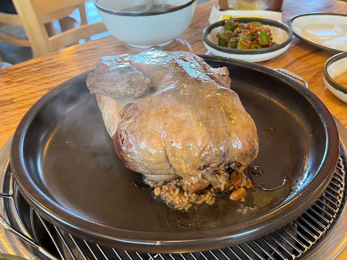 음식이 식지 않고 계속 따뜻하게 유지 될 수 있도록 숯불을 넣어둔 철판 위에 장독대 뚜껑(?) 접시채로 올려주셨습니다.
