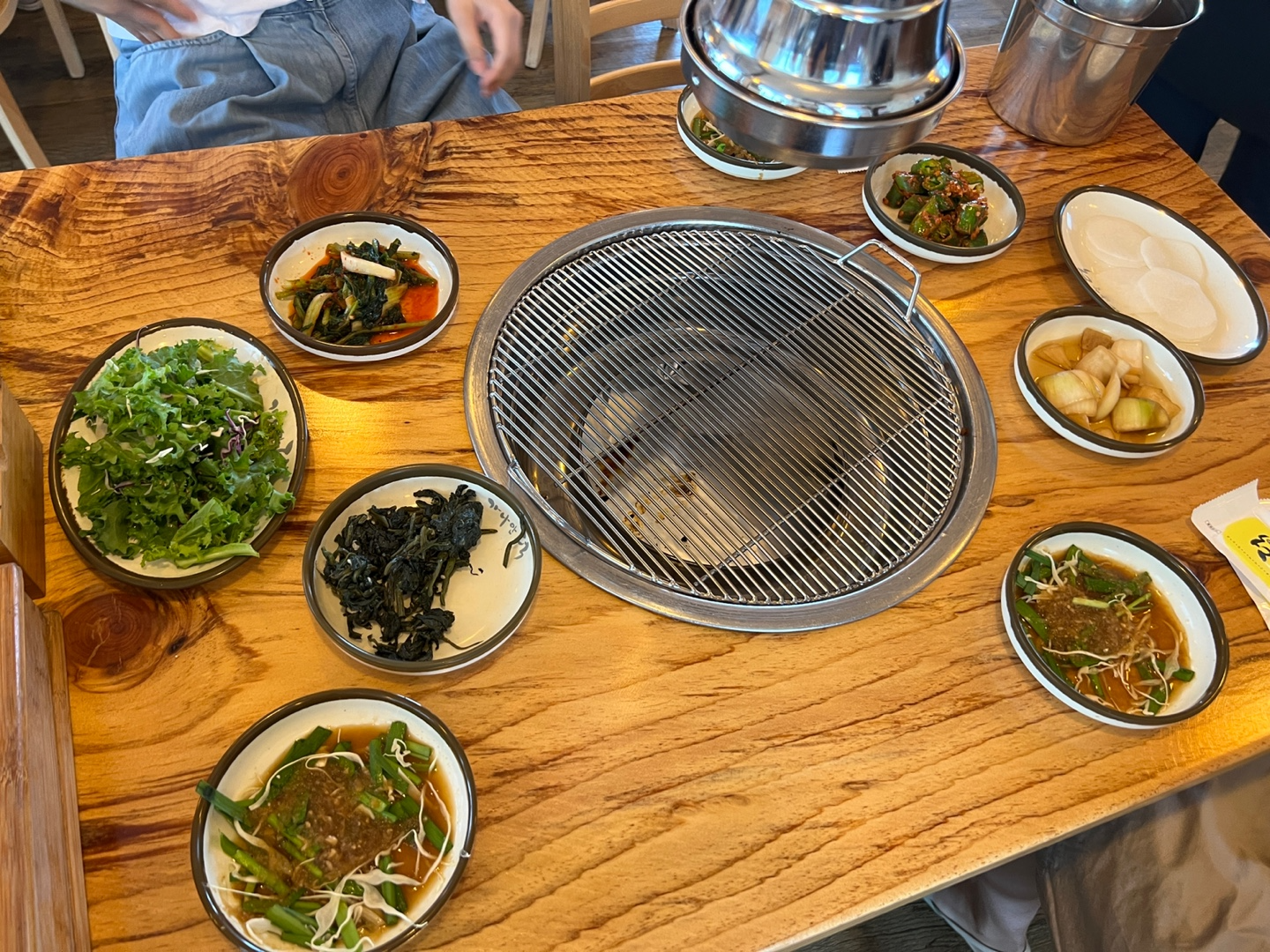 자리에 앉으면 인원수에 맞게 갖가지 반찬들과 알아서 나눠 먹을 수 있도록 큰 그릇에 우거지국을 세팅해 주세요.(사진엔 국이 빠졌네요.) 반찬및 쌈은 셀프로 리필할 수 있습니다.