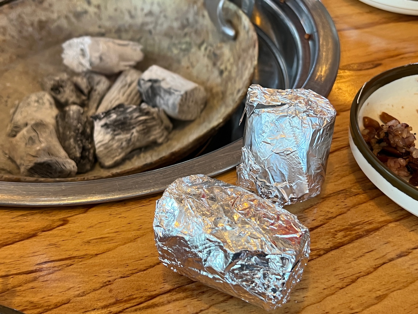 그리고 화로에 불을 넣고 은박지로 감싼 고구마를 나중에 먹을 수 있도록 넣어주십니다. 이것도 아마 인원수에 맞춰 주시는듯합니다.