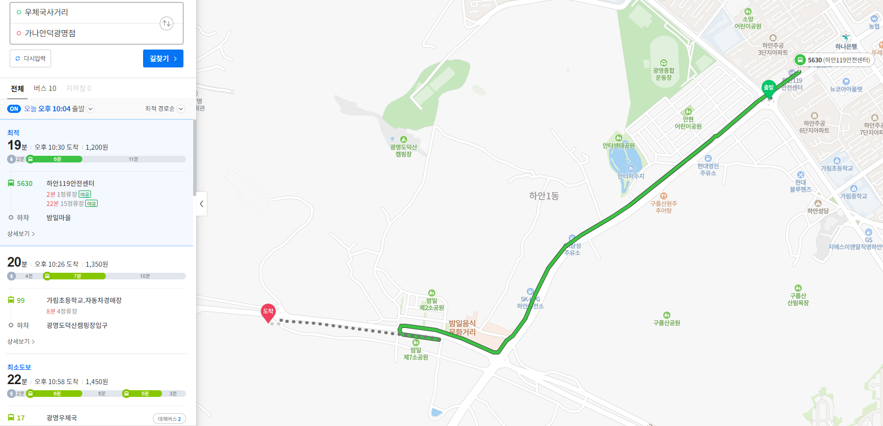 오리요리 전문점 가나안덕 위치는 음식점, 카페가 밀집되어있는 밤일마을쪽인데요. 밤일마을 하면 차가 있어야 갈 수 있을것 같고 가까우면서도 먼것 같지만 생각보다 버스를 이용해서 어렵지 않게 갈 수 있습니다. 광명시 주민이시라면 거리를 체감하시기 편하게 우체국 사거리에서 부터 식당 위치 길찾기를 해봤는데요. 대중교통으로 넉넉잡고 30분 이내로 갈 수 있는 정도 입니다.