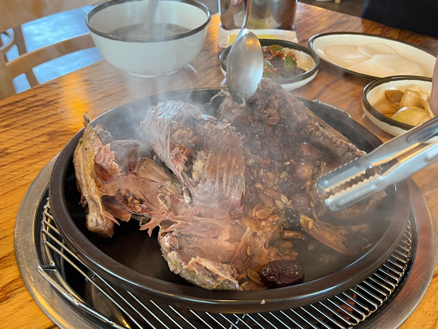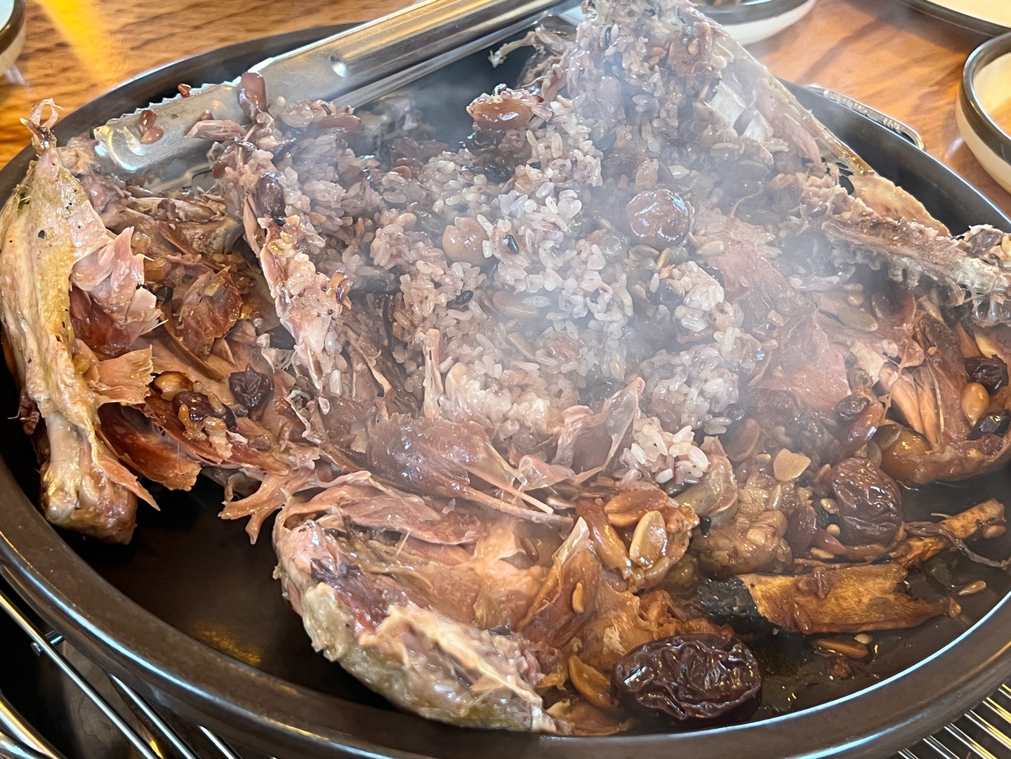 직원분께서 바로 먹기 쉽게 펼쳐주셨는데요. 펼치자마자 김이 모락모락 나면서 기름기 빠진 오리고기 속살과 각종 견과류, 대추, 약재등이 함께 어우러진 영양밥이 보였습니다.