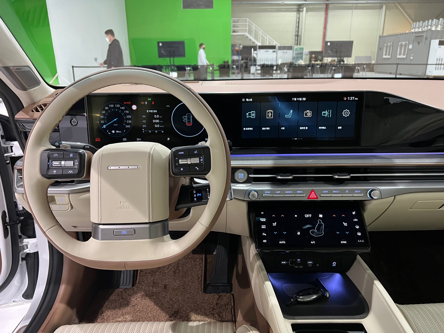 현대 그렌져 모델은 인체공삭의 기반을한 슬림화 디자인으로 버튼의 최적화 등으로 사용 편의성을 높혔으며 넓은 공간감과 고품격 감성 공간을 보여주고 있다. 특히나 실내에서 가장 눈에 띄는 12.3인치 클러스터와 12.3인치 내비게이션은 일체형으로 통합형으로 깔끔함을 보여주고 있으며 공조 컨트롤러 시스템은 10.25인치로 기존에 볼 수 없었던 새로운 방식의 풀 터치 디자인 방싱을 채용했다.