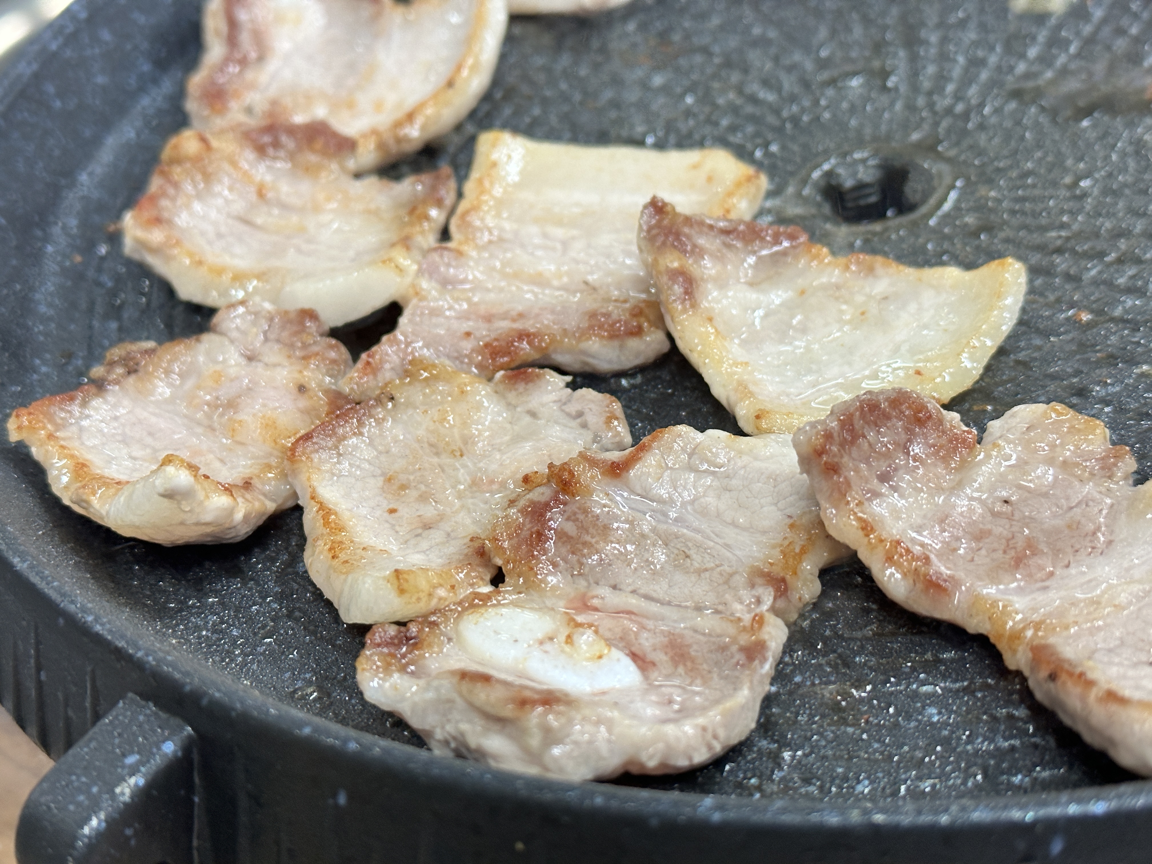 처음 삼겹살을 봤을 때 지방이 많아서 별로일거라 생각했지만 냉동고기가 아닌 생고기로 하이포스 국내산 삼겹살은 바싹 노릇노릇하게 구웠을때 삼겹살에 지방이 쫀득하면서 고소한 맛을 한층 높혀주는 것이 특징이다. 지방이 많이 빠져나오는 기름이 많으니 바싹 구워주면 좀 더 맛있게 먹을 수가 있다.