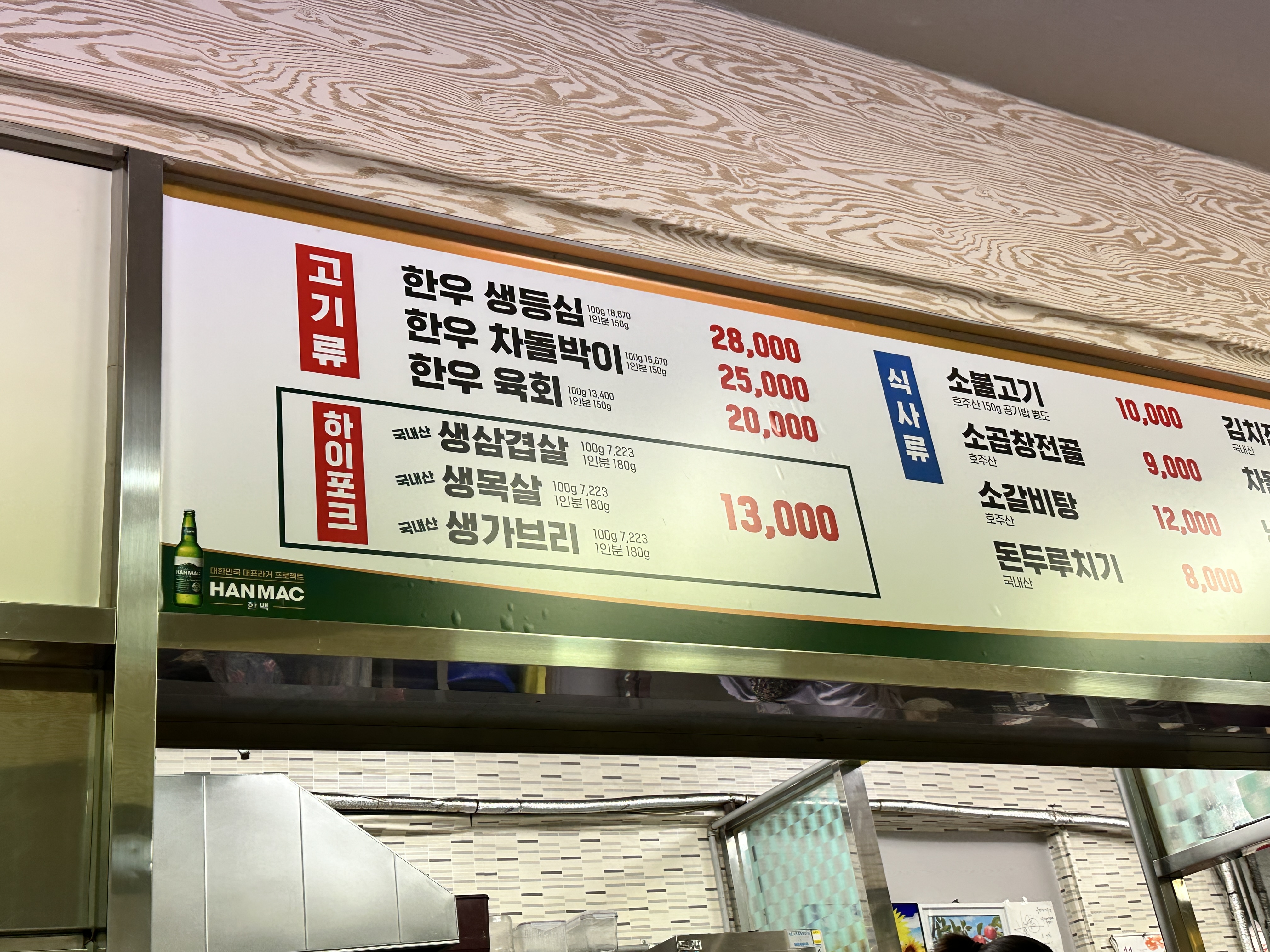 보통 회식을 하면 법인카드로 먹는 것이 대부분이지만 가끔은 팀 회식을 위하여 팀장이 직접 개인카드로 사줘야하는 경우에 부담이 없는 곳이라 생각된다. 1인분 180g 기준으로 생삼겹살 그리고 생목살과 생가브리살이 1인분에 13,000원정도로 괜찮은 가격이고 한우 생등심도 28,000원 수준으로 괜찮은 가격을 보여준다. 여기에 식사류까지 더할 수 있는 점이 특징이다.