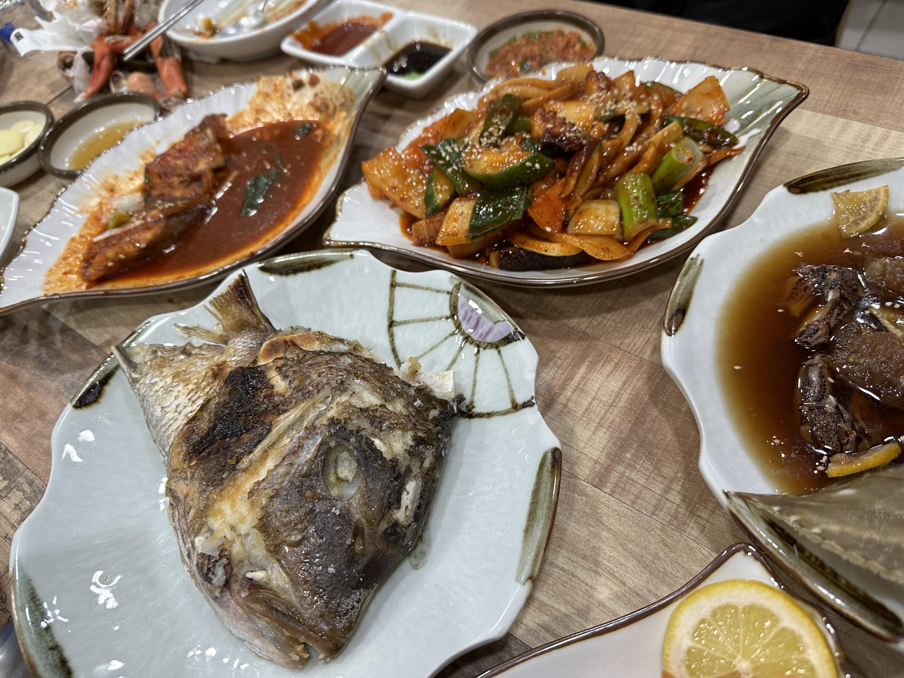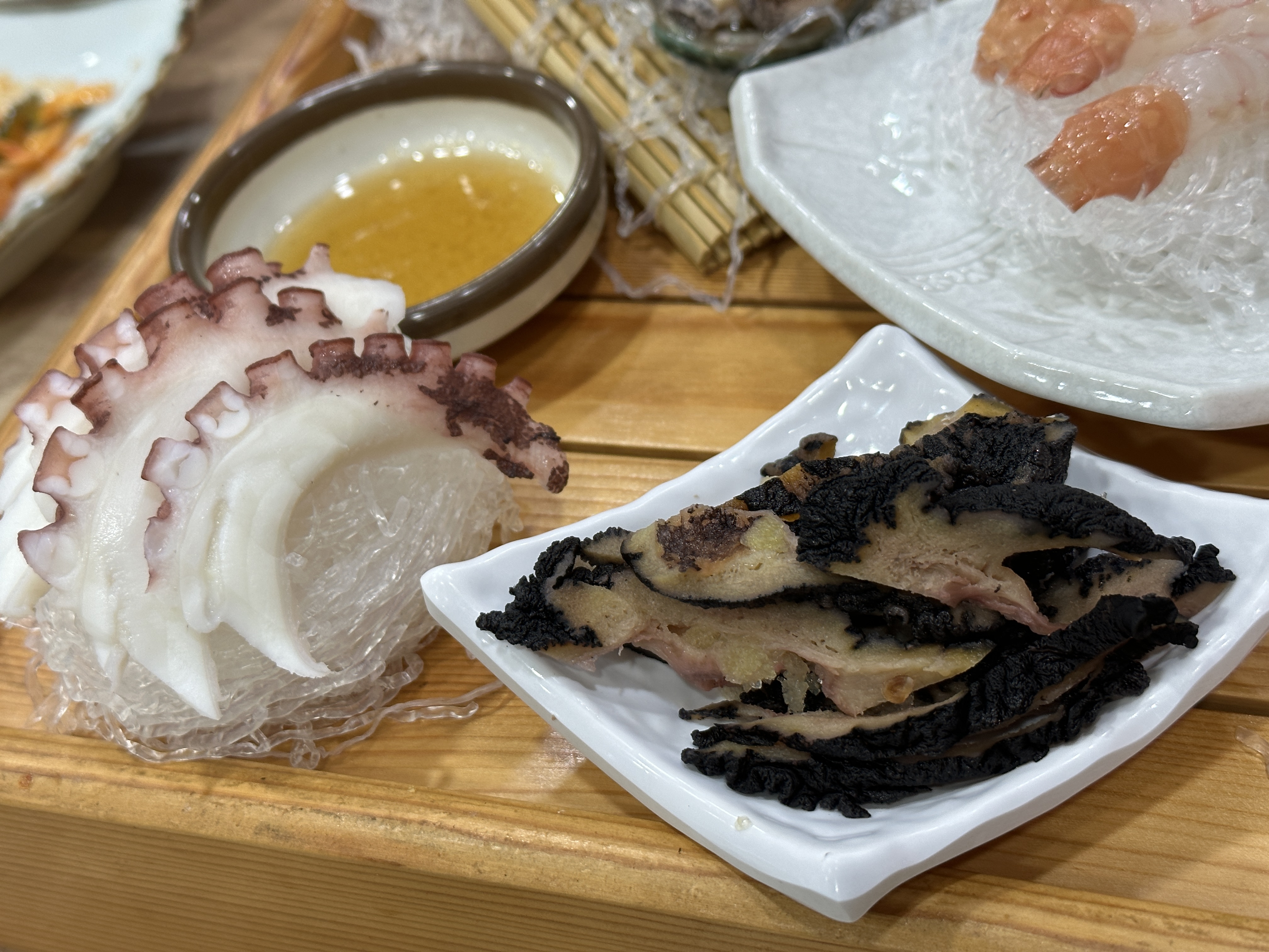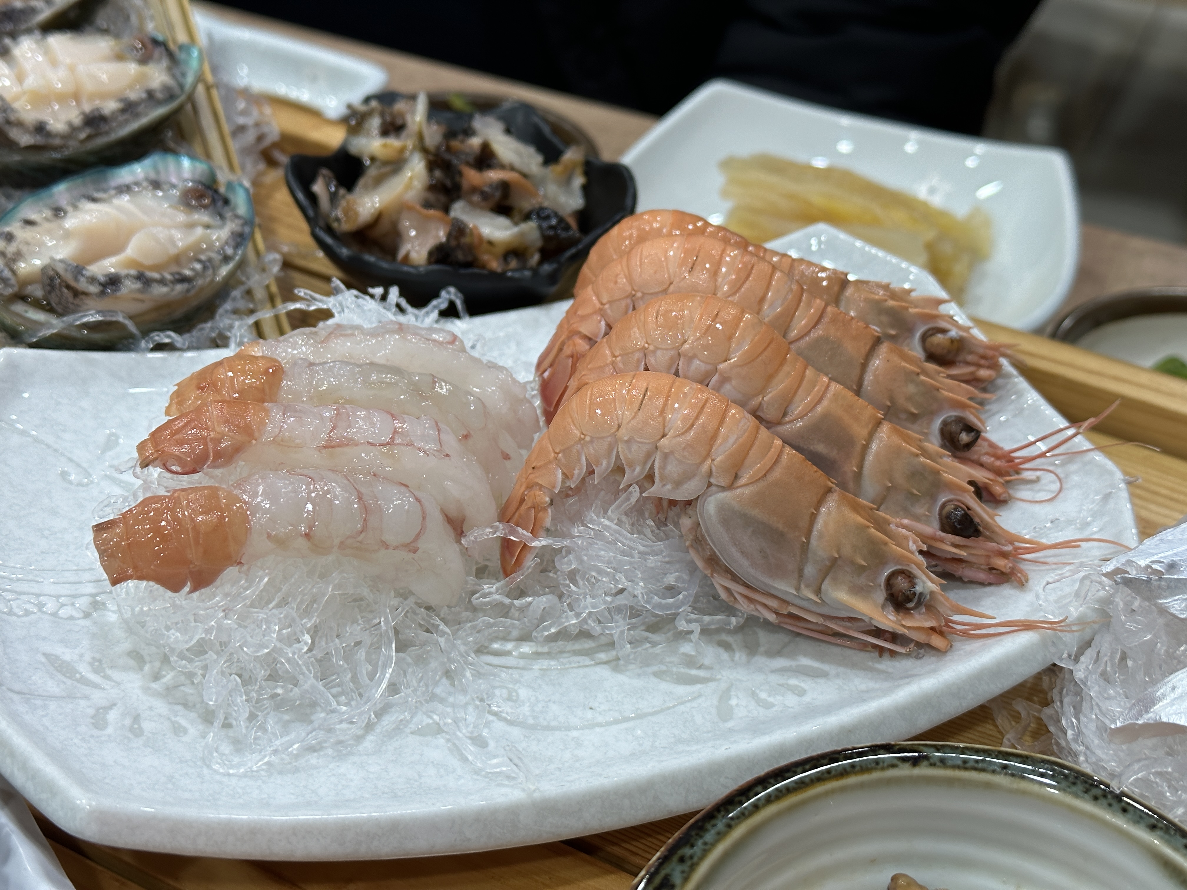 실제 나오는 메뉴가 계절에 따라서 다를 수 있으니 참고만 하면 좋겠다. 기본적으로 딱 새우가 인원수대로 나오는데 딱새우 회는 정말 싱싱해서 달다는 말이 절로 나온다. 여기에 딱새우찜과 전복, 소라, 문어 여기에 군소를 삶아서 나오기도 하는데 군소를 실제로 처음 먹어보았다. 여기에 어떤 생선인지는 잘 모르겠지만 불향을 살짝 입힌 초밥은 왜 초밥 메뉴가 따로 있는지 알 수 있을 거 같은 맛이었다. 여기에 동문시장 맛집인 이 곳에서는 모둠회로 다양한 횟감들을 한 번에 맛볼 수 있어 기분은 훌륭한 곳이었다.