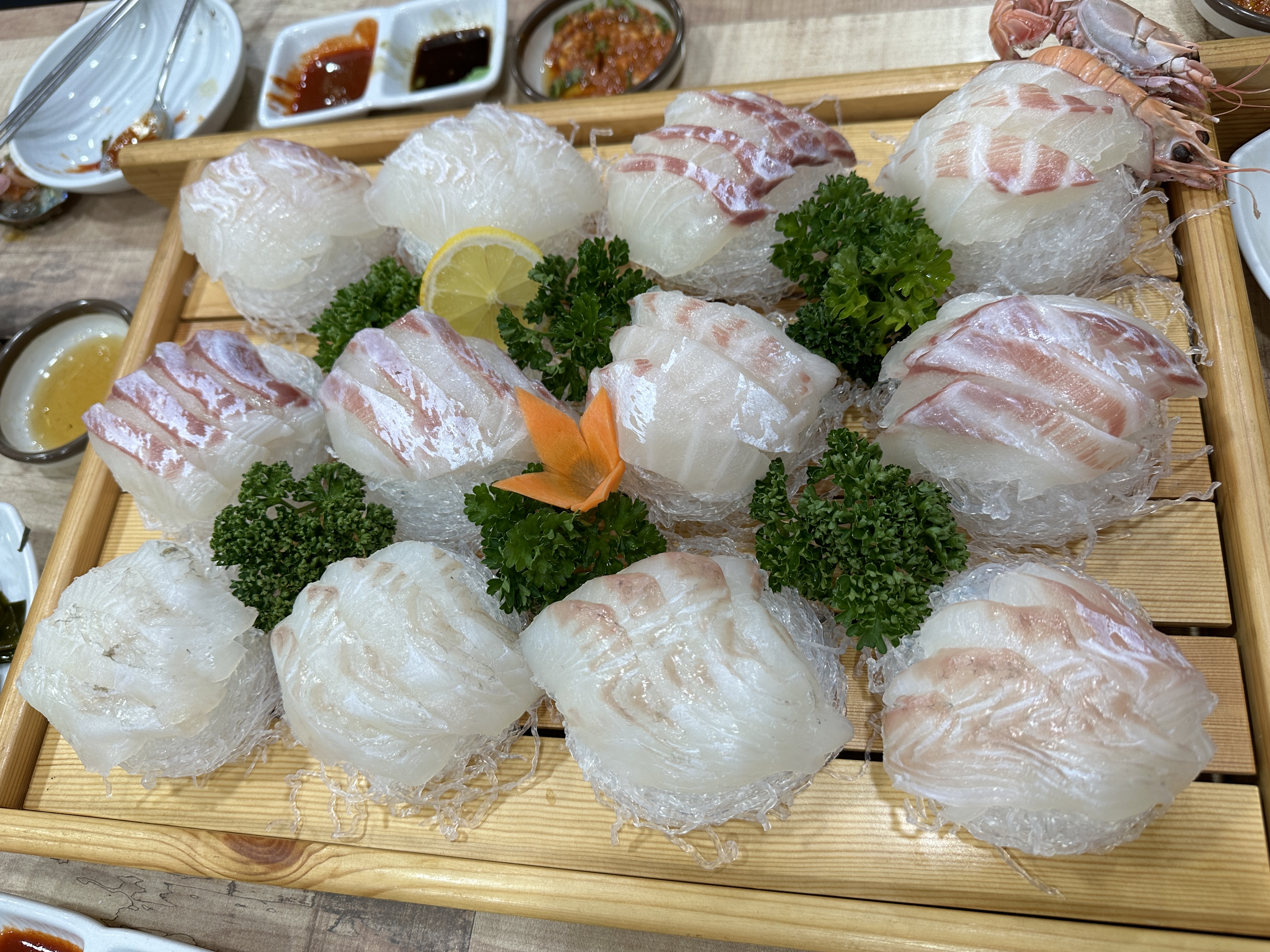 실제 나오는 메뉴가 계절에 따라서 다를 수 있으니 참고만 하면 좋겠다. 기본적으로 딱 새우가 인원수대로 나오는데 딱새우 회는 정말 싱싱해서 달다는 말이 절로 나온다. 여기에 딱새우찜과 전복, 소라, 문어 여기에 군소를 삶아서 나오기도 하는데 군소를 실제로 처음 먹어보았다. 여기에 어떤 생선인지는 잘 모르겠지만 불향을 살짝 입힌 초밥은 왜 초밥 메뉴가 따로 있는지 알 수 있을 거 같은 맛이었다. 여기에 동문시장 맛집인 이 곳에서는 모둠회로 다양한 횟감들을 한 번에 맛볼 수 있어 기분은 훌륭한 곳이었다.