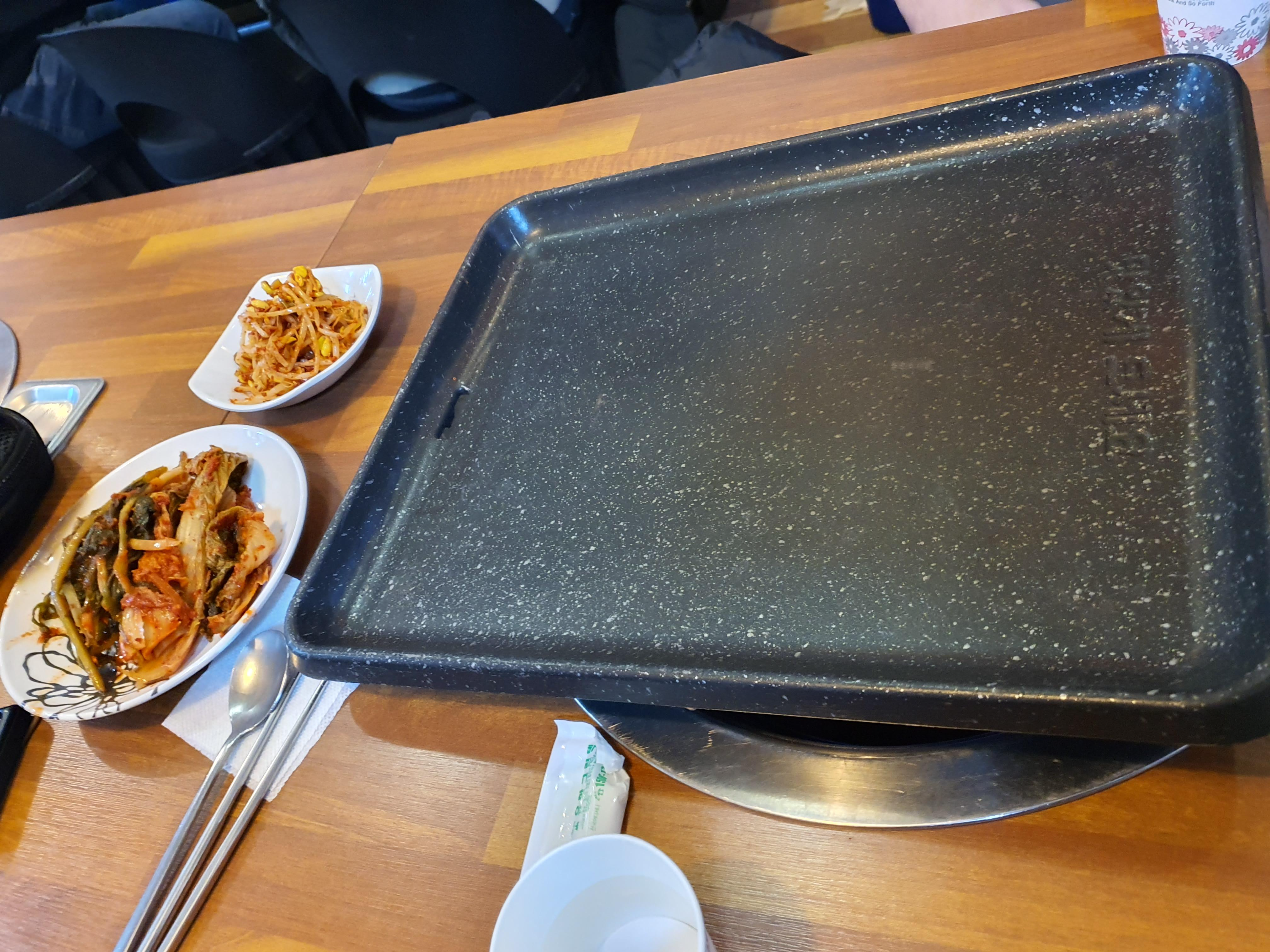 뚝섬역 삼겹살 전문점 손박사 삼겹살 & 갈비의 불판은 이렇게 되어 있다. 사실 이 곳에서 돼지갈비를 먹어보지 않아서 어떻게 나오는지 모르겠지만 이 곳이 삼겹살 맛집으로 유명한 만큼 묵은지 삼겹살이나 돼지 한마리 모둠 세트를 가장 많이 시키기 때문에 보통 이렇게 먹는다고 생각하면 될듯하다.
