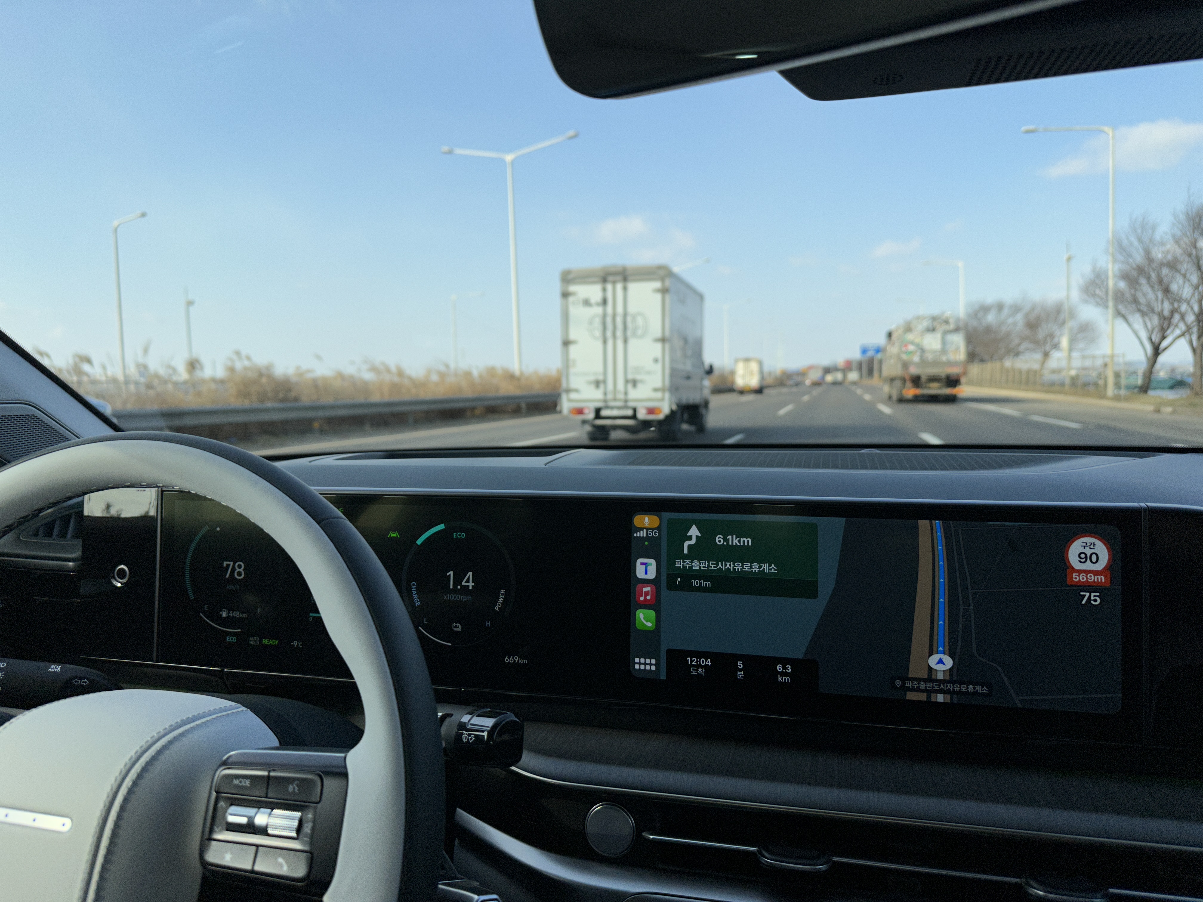 이번에는 월드컵 경기장에서 파주 출판단지 휴게소까지 주행을 시작해 봤다. 자유로를 달리면서 대략적으로 어느 정도 연비가 나올지에 대해서 테스트를 시작해봤는데 시속 50~90km/h로 안전 속도에 유의하면서 달려본 결과 약 30.2km 주행에 시간은 42분 소요되었고 연비는 16.8km/L를 보여줬다. 20인치 휠/타이어 사이즈를 적용하고 복합연비 15.7km/L라는 점을 놓고 본다면 대략적으로 약 7% 높게 나왔다.