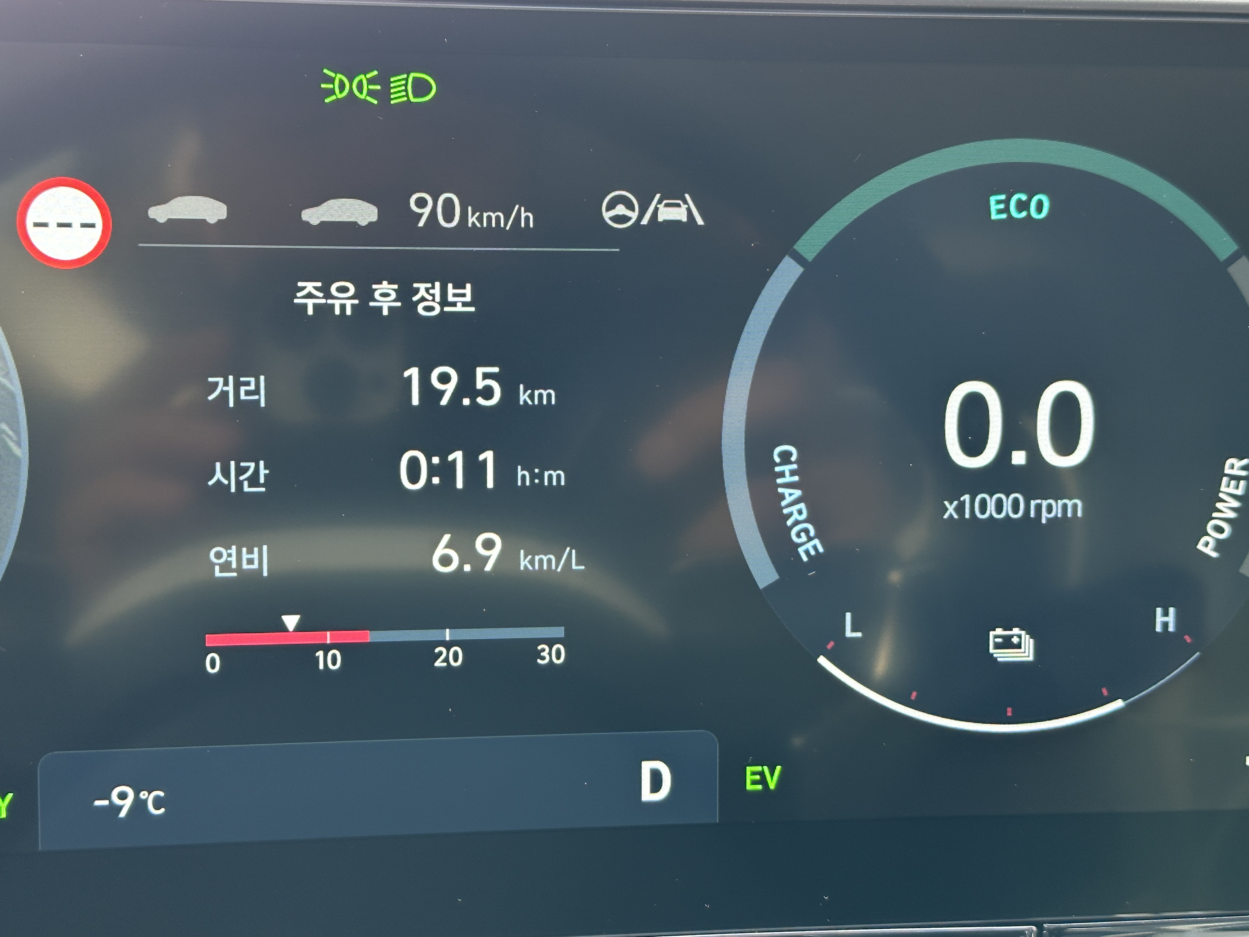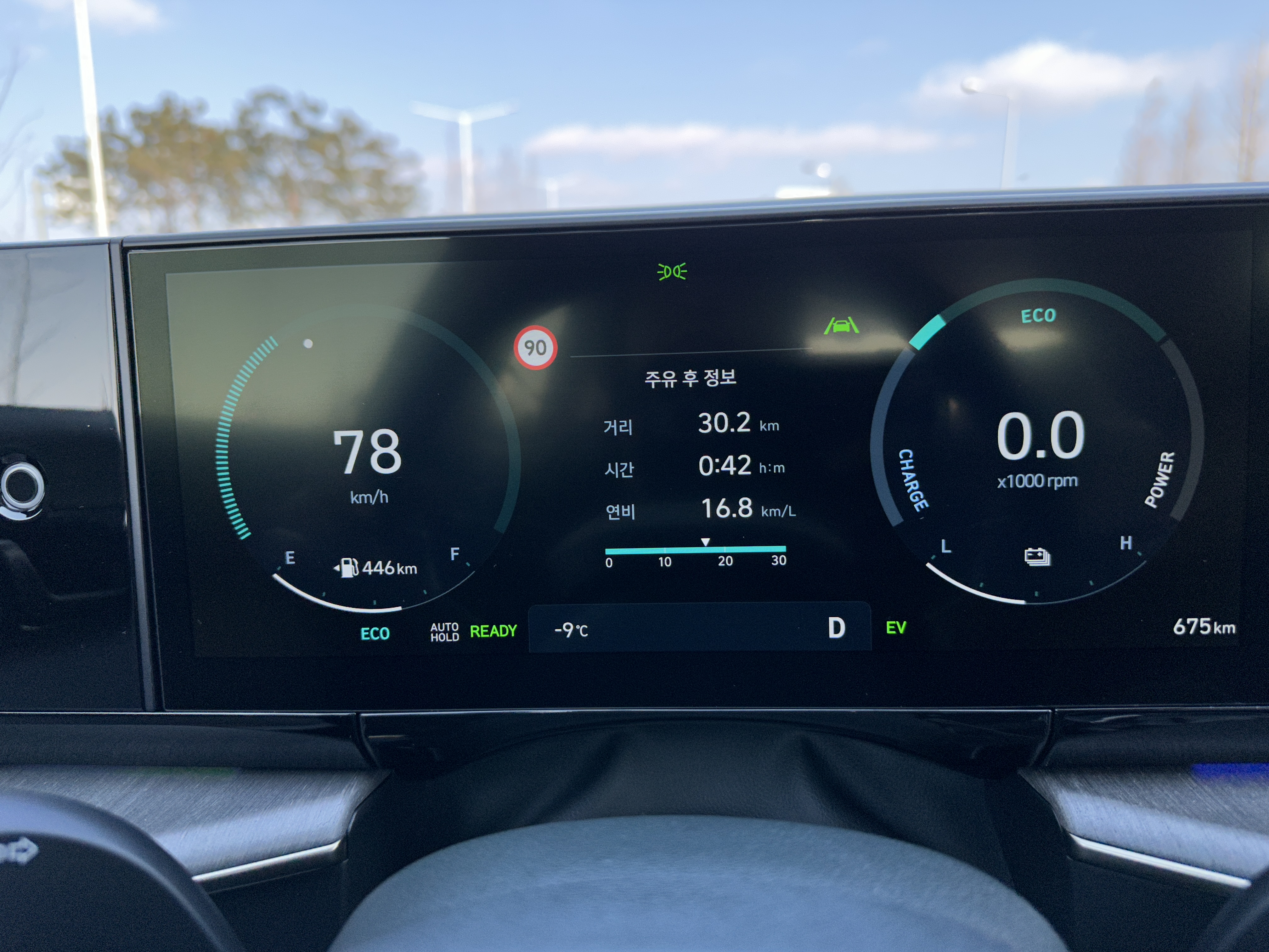 그렇다면 반대로 스포츠 모드로 1.6 가솔린 터보 하이브리드를 막 밟아보면 연비는 어느 정도일까??