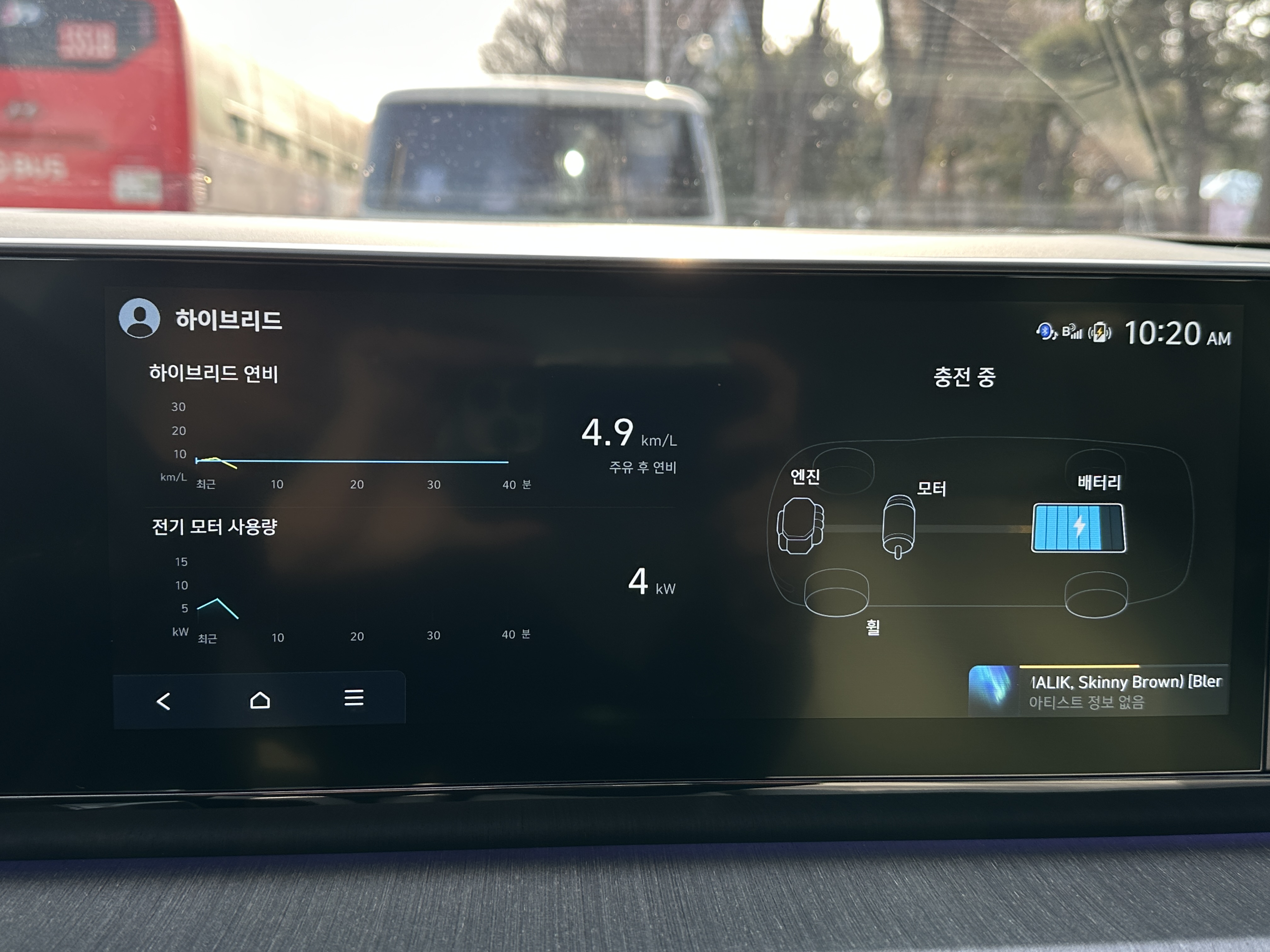 내부순환도로를 올라타면서 차량에 정체가 시작되었다. 이때부터 EV 모드를 적극적으로 사용하였는데 90km/h 어댑티브 크루즈 컨트롤을 사용해서 주행하기보다는 오히려 약간 막히는 도로에서 어댑티브 크루즈 컨트롤은 EV 모드를 적극사용했다. 이전 소나타 / K5 하이브리드 모델들이 시속 110km/h까지 EV 모드를 적극적으로 사용하는 것과 다르게 도심에서 시속 60km/h 미만에서 EV 모드를 적극적으로 사용하여 연비가 꾸준히 상승했다. 떨어졌다를 반복했다.