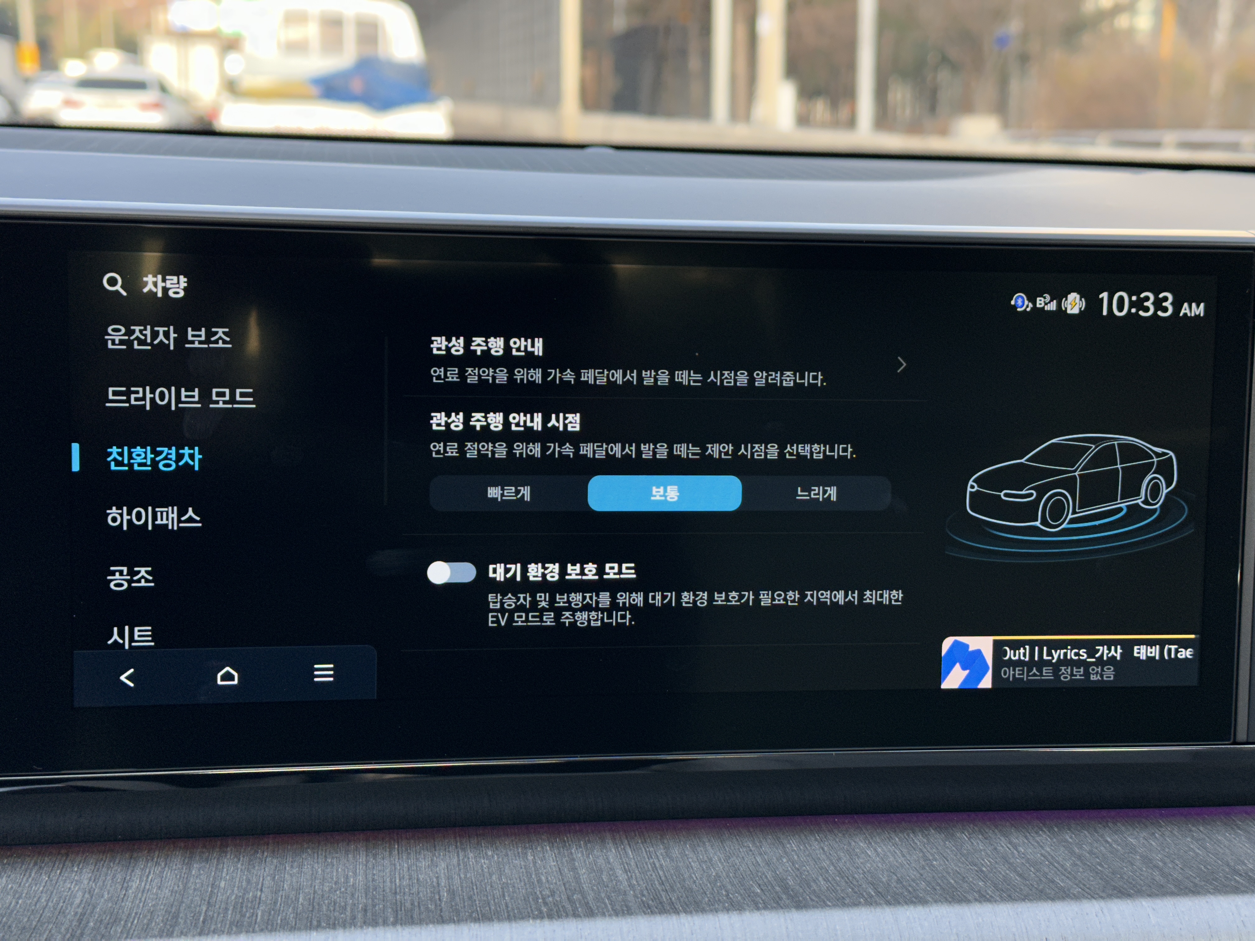 이번 그랜저 하이브리드 모델에는 관성 주행이 추가 되었다. 연료 절약을 위해서 가속 페달에서 발을 떼는 시점을 알려주는데 가속 페달에서 발을 떼는 제안 시점을 어떻게 할 것인지를 세팅할 수 있다. 또한 대기 환경 보호 모드로 탑승자와 보행자를 위해서 대기 환경 보호가 필요한 지역 예를 들면 우리 집을 세팅해두면 그린존으로 인식해서 주거지 대기오염을 최소화하는 기능인데 사실 친절한 설명이 없어서 정확히 어떤 지역이 대기환경 보호 모드인지 알기 어렵다.