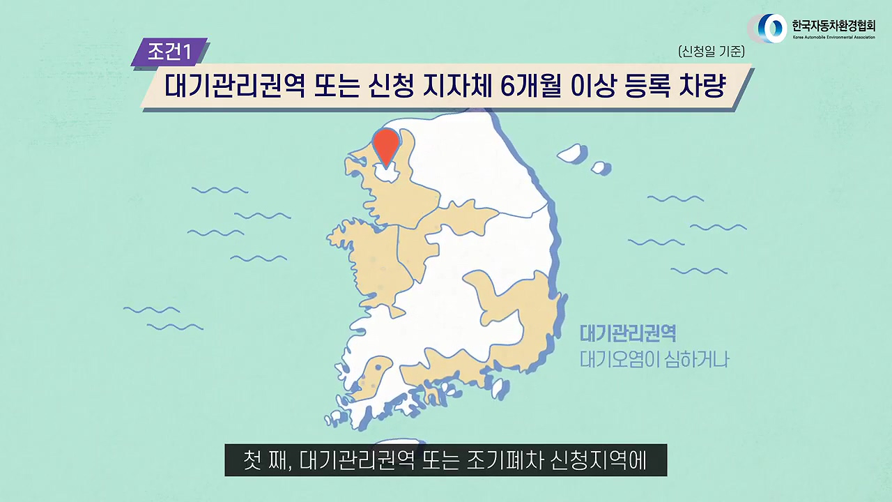 #차량조기폐차 대상을 살펴보면 첫 번째로 대기관리권역 또는 조기폐차 신청지역 (지자체)에 6개월 이상 등록 차량이어야 한다. 내가 살고 있는 곳이 조기폐차 신청지역인지 아닌지를 확인하려면 각 지자체 환경과 혹은 한국자동차환경협회에 문의하면 된다. 국번 없이 1577-7121