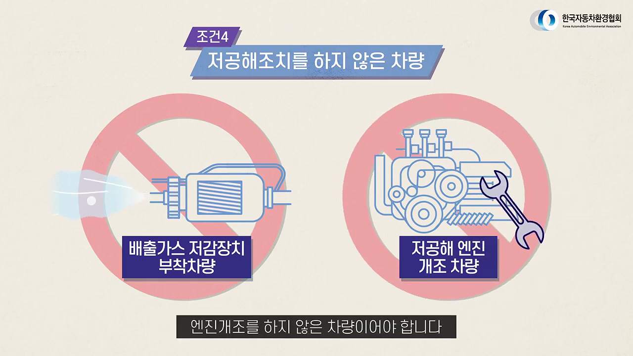 최근 출시되는 디젤 차량 같은 경우는 배출가스 저감장치 (디젤 DPF)가 부착된 차량이고 SCR (요소수) 를 넣는 차량이면 해당되지 않는다. 다만 차량 출고 시 배출가스 저감장치 부착차량이 아니였지만 정부 지원으로 장착한 차량 또한 해당되지 않는다. 여기에 LPG / 전기 등 저공해 엔진 개조 차량이 아니어야 신청 가능하다.