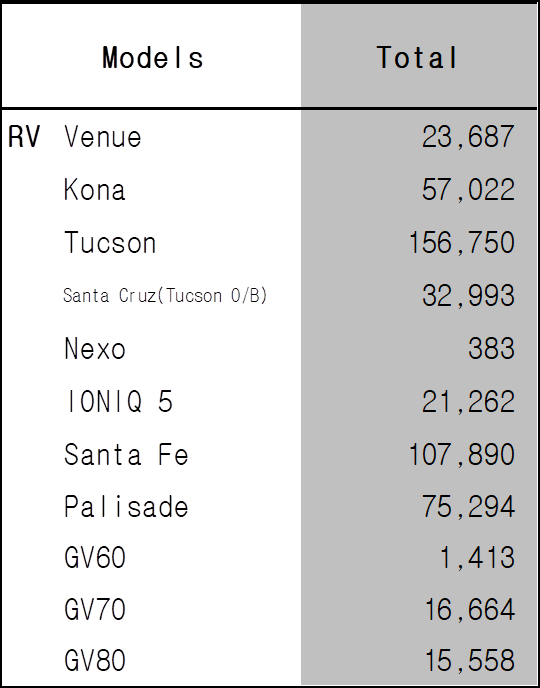 특히 가장 기대되었던 북미 시장에서 15,558대 (1~11월까지 판매량)은 시장 마켓 사이즈에 비해서 상당히 아쉬운 판매량을 보여준다. 반면 싼타페 모델은 북미에서 10만 대 이상을 판매하여 국내 같은 기간 24,894대에 비해서 꽤 많은 판매량을 보여줬으며 팰리세이드 또한 미국 시장에서 국내 판매보다 높은 판매량을 보여주고 있다. 여기에 투싼 모델이 특히나 인기가 좋은데 156,750대로 같은 기간 국내 판매량 약 3만 대 보다 5배나 높은 판매량을 보여주고 있다.