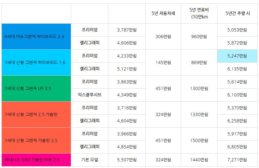 5년 자동차세 그리고 5년 연료비를 모두 더하고 차량 가격은 모두 전액 5년 풀 할부 (금리 제외)라고 했을 때 가장 저렴한 차량은 6세대 더 뉴 그랜저 2.4 하이브리드 모델이였다. 확실히 차량 가격에서 400만원 이상 차이를 보여주기 때문에 5년간 주행으로 총 금액 194만원으로 줄어들었기에 약 10년에 20만km 주행이라면 신형 하이브리드 모델이 좀 더 유리하다.