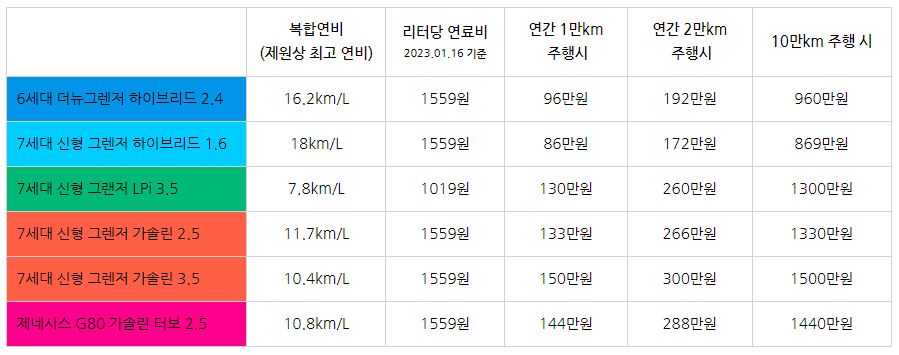 가장 높은 연비를 보여주는 차량은 역시나 7세대 신형 그랜저 하이브리드 모델이다. 제원상 최고 연비 기준으로 18km/L를 보여주고 있으며 6세대 모델 같은 경우는 이보다 약 1.8km/L 낮은 16.2km/L를 보여준다. 가장 낮은 연비를 보여주는 3.5 LPi 모델은 7.8km/L로 낮은 연비이지만 리터당 LPG 연료비가 가장 낮다. 따라서 연간 2만km 주행 시 1.6 터보 하이브리드가 172만원으로 가장 낮았고 가장 높은 비용은 7세대 그랜저 3.5 가솔린 모델이 300만원으로 다소 높은 편이고 심지어 제네시스 2.5 터보 보다 더 높은 가격 차이를 보여준다. 또한 3.5 LPi 모델은 가솔린 2.5와 비슷하다는 점이 특징이다.