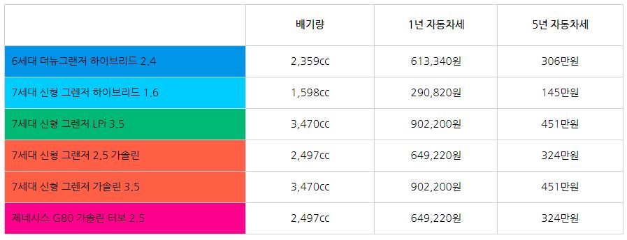 역시나 배기량이 가장 높은 3.5 가솔린과 LPi 모델이 가장 높은 1년 90만원 대를 보여주고 있으며 1.6 터보 하이브리드 모델은 1년 29만원으로 가장 낮은 가격대를 보여줬다. 렌트 차량이나 리스 차량이라면 크게 상관이 없겠지만 할부로 개인 명의로 구매하는 경우 5년에 자동차 세금만 약 300만원이나 차이가 난다는 사실을 구매 전에 인지하고 있어야 한다.